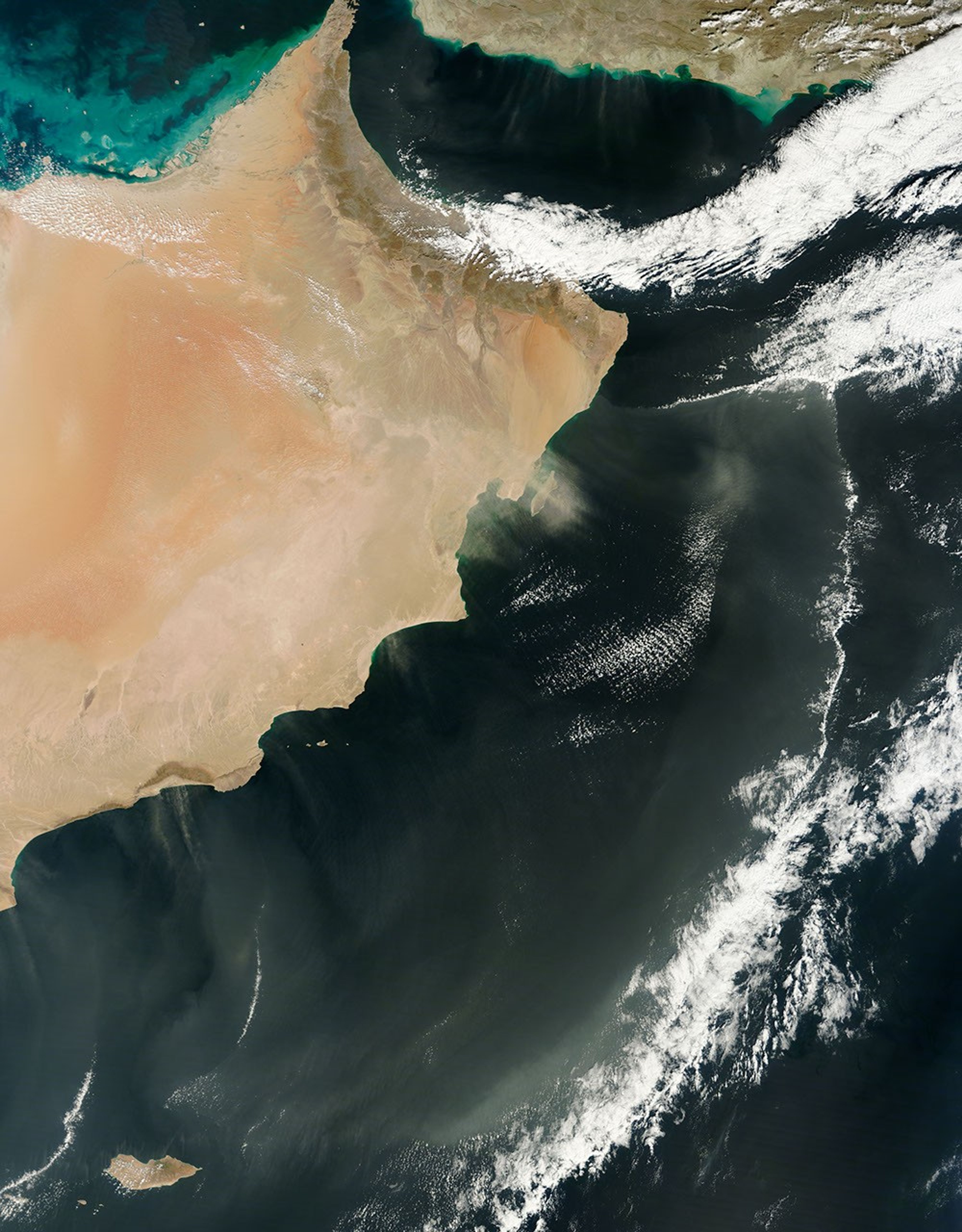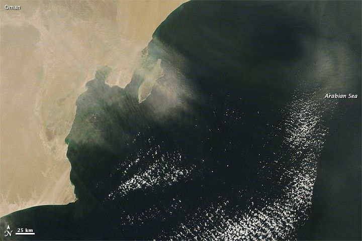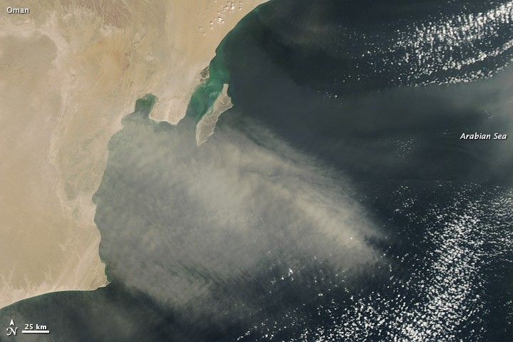 In early February 2013, dust plumes blew off the coast of Oman and over the Arabian Sea. The Moderate Resolution Imaging Spectroradiometer (MODIS) on NASA’s Terra and Aqua satellites captured these natural-color images on the morning (top) and afternoon (bottom) of February 4. In the roughly three hours separating these images, the dust plumes lengthened and shifted southward.