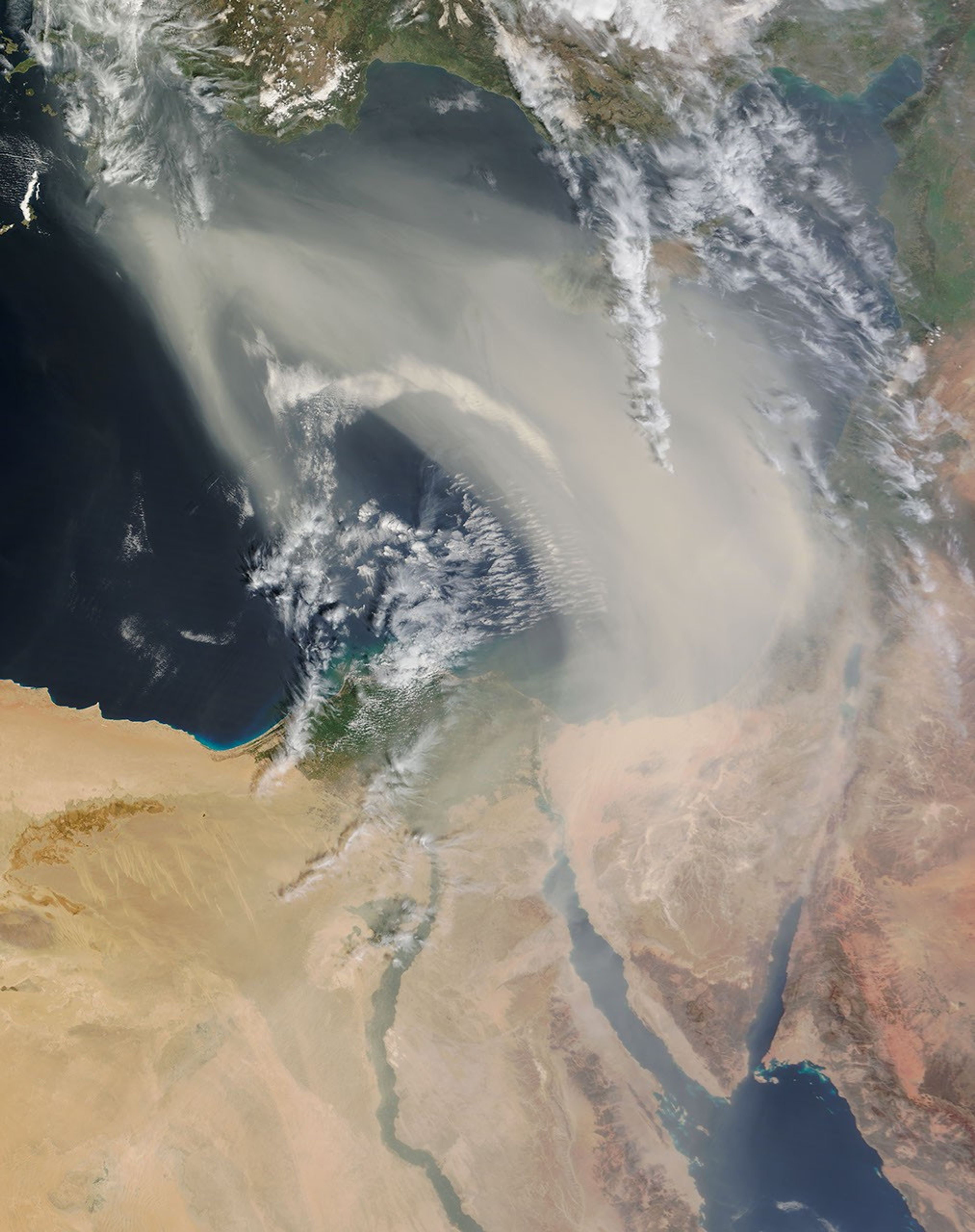 A thick plume of dust blew over the eastern Mediterranean Sea on April 1, 2013, extending northward from Egypt toward Turkey in a giant, counter-clockwise arc. Between Egypt and Turkey, dust clogged skies over Israel, the West Bank, and Cyprus. The Moderate Resolution Imaging Spectroradiometer (MODIS) on NASA’s Terra satellite captured this natural-color image of the dust plume the same day.