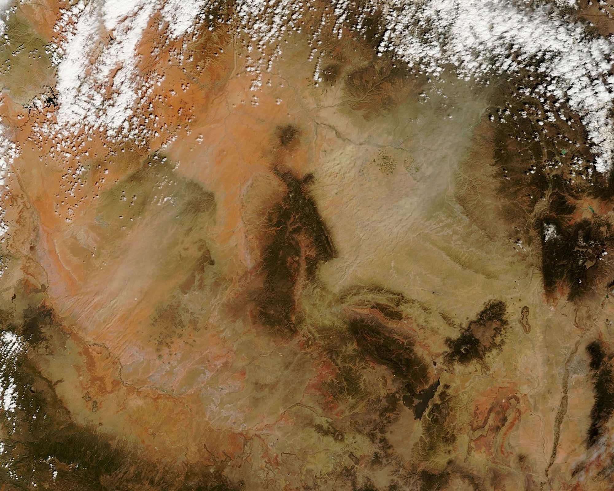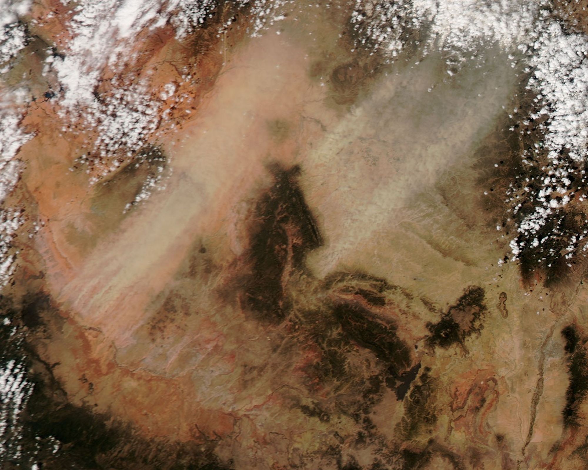 Dust plumes blew over parts of Arizona, New Mexico, Colorado, and Utah on April 16, 2013. The dust plumes arose in two large clusters, one in northeastern Arizona, and the other in northwestern New Mexico. The dust plumes grew in both size and intensity through the day. The plumes blew toward the northeast, possibly stirring additional particles as they moved.