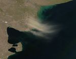 Continuing an intermittent pattern from the previous month, more dust plumes blew off Argentina’s coast on February 17, 2009. The Moderate Resolution Imaging Spectroradiometer (MODIS) on NASA’s Aqua satellite captured this image the same day. In this image, the dust plumes form slight arcs, moving in a counter-clockwise direction over the Atlantic Ocean.