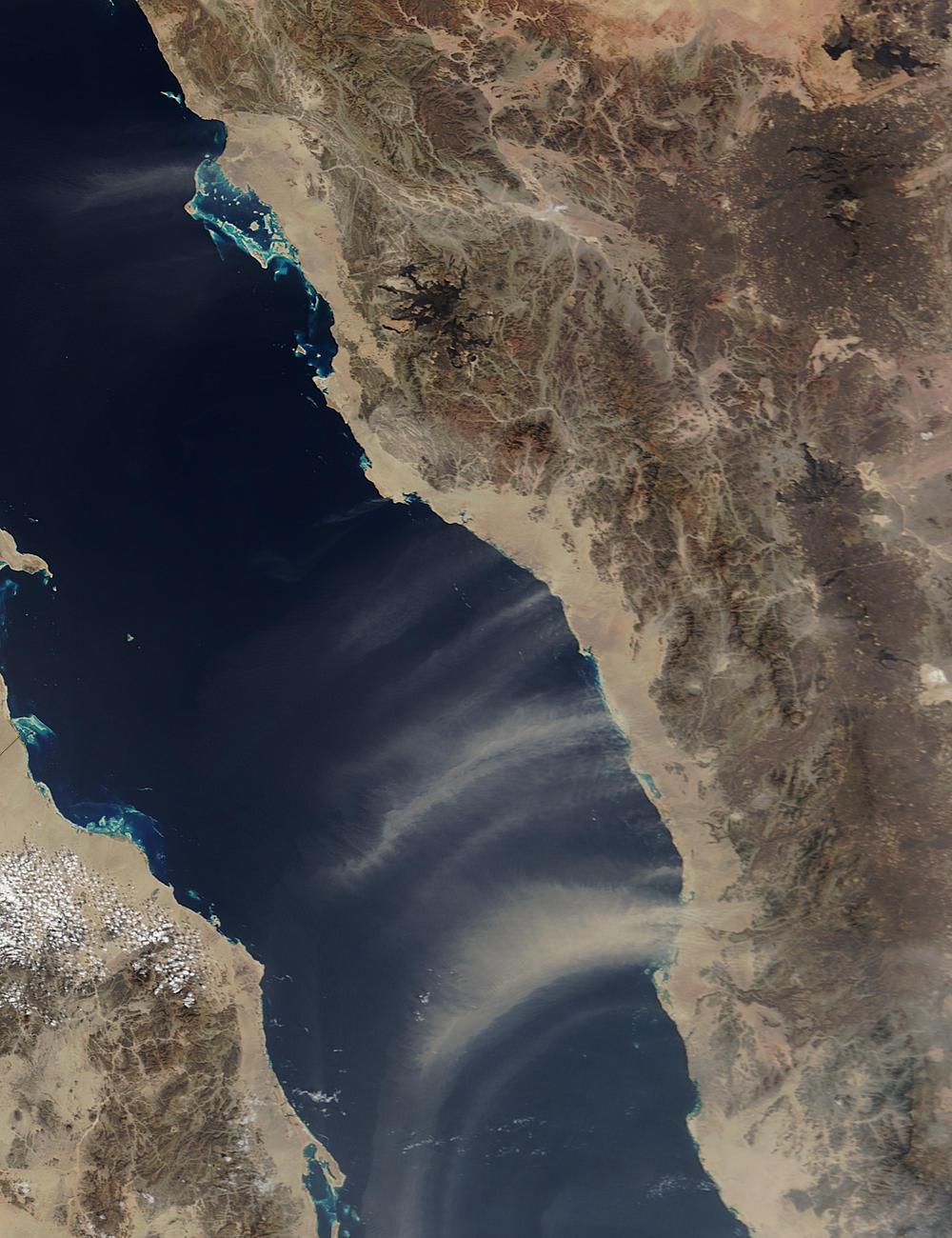 Arcing plumes of tan-colored dust hang over the blue waters of the Red Sea in this Moderate Resolution Imaging Spectroradiometer (MODIS) image captured on February 8, 2004, by the Terra satellite. The plumes originate on the Arabian Peninsula (image right) and stretch toward northeastern Africa (bottom left). Dust storm activity has been high across a large part of Africa and the Middle East during early February. The high-resolution image provided above is 500 meters per pixel. The MODIS Rapid Response System provides this image at additional resolutions.