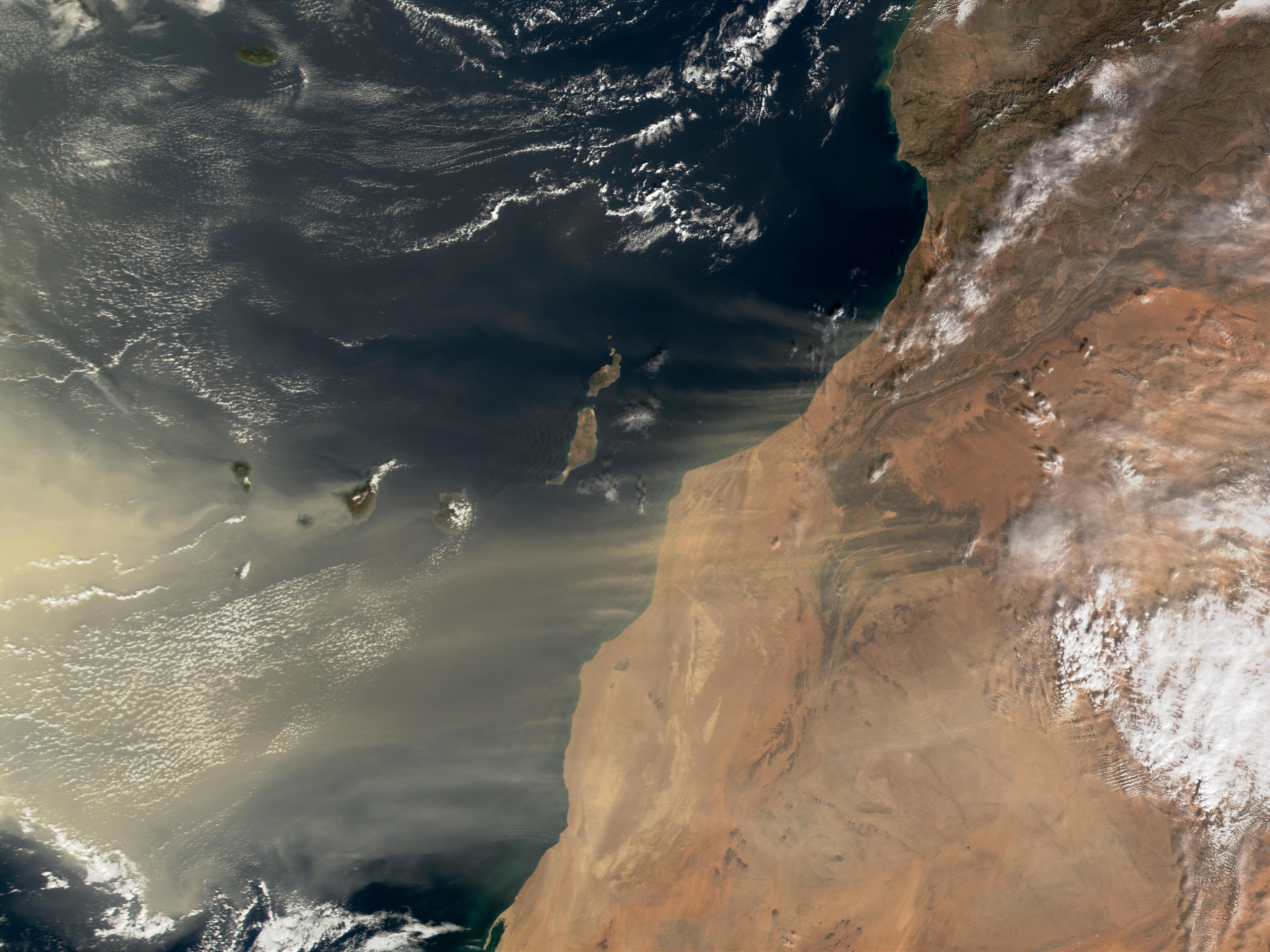 In this scene, notice how the dust appears particularly thick in the downwind wake of Tenerife, the largest of the Canary Islands. Perhaps the turbulence generated by the air currents flowing past the island’s volcanic peaks is churning the dust back up into the atmosphere, rather than allowing it to settle toward the surface.