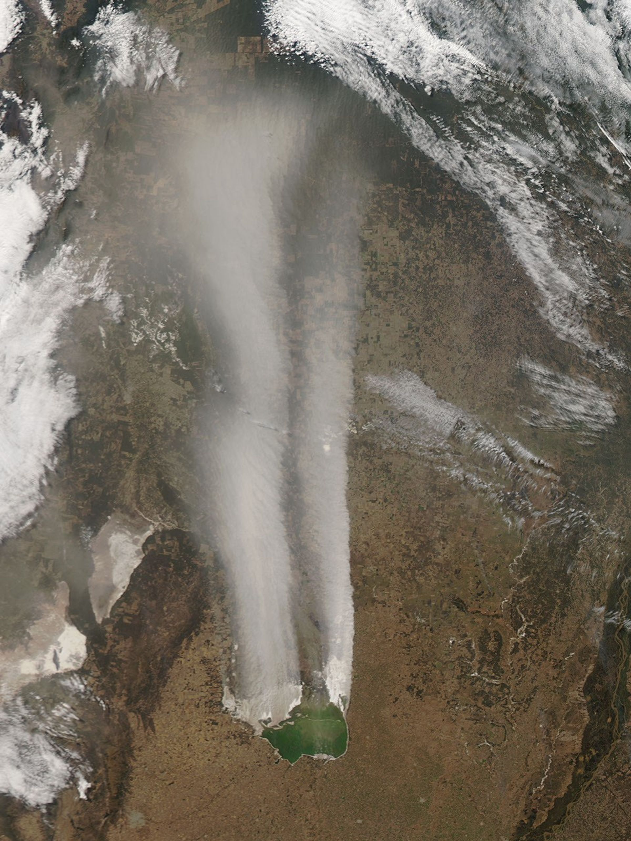 Dust plumes blew northward from Argentina’s Laguna Mar Chiquita in late July 2012. The Moderate Resolution Imaging Spectroradiometer (MODIS) on NASA’s Aqua satellite captured this natural-color image on July 29.