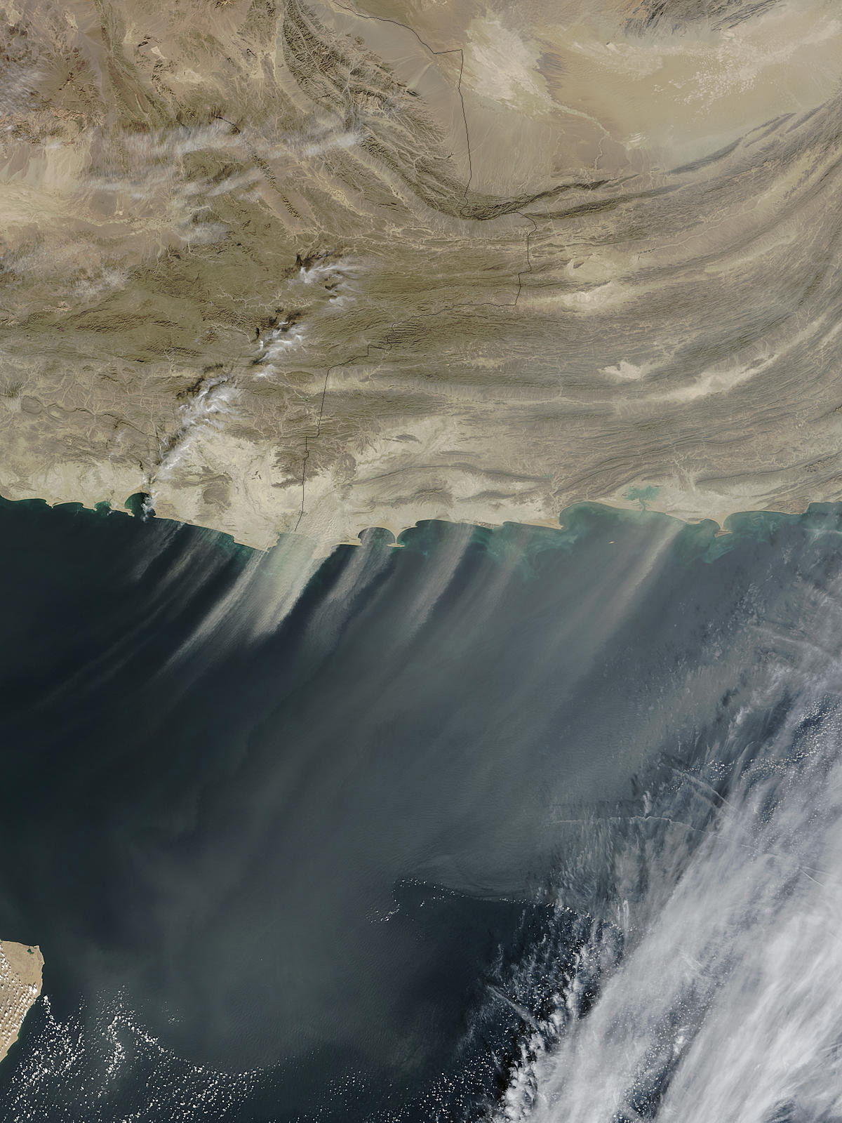A large storm is blowing thick plumes of desert dust over the Arabian Sea. The dust is coming from the shores of Pakistan (right) and Iran (left). The pattern seen in this image is common. Winds often blow down from Makran Coast Range in Western Pakistan and Eastern Iran into the coastal valleys, and carry dust out over the Sea. This Moderate Resolution Imaging Spectroradiometer (MODIS) image was acquired by the Terra satellite on November 24, 2003.