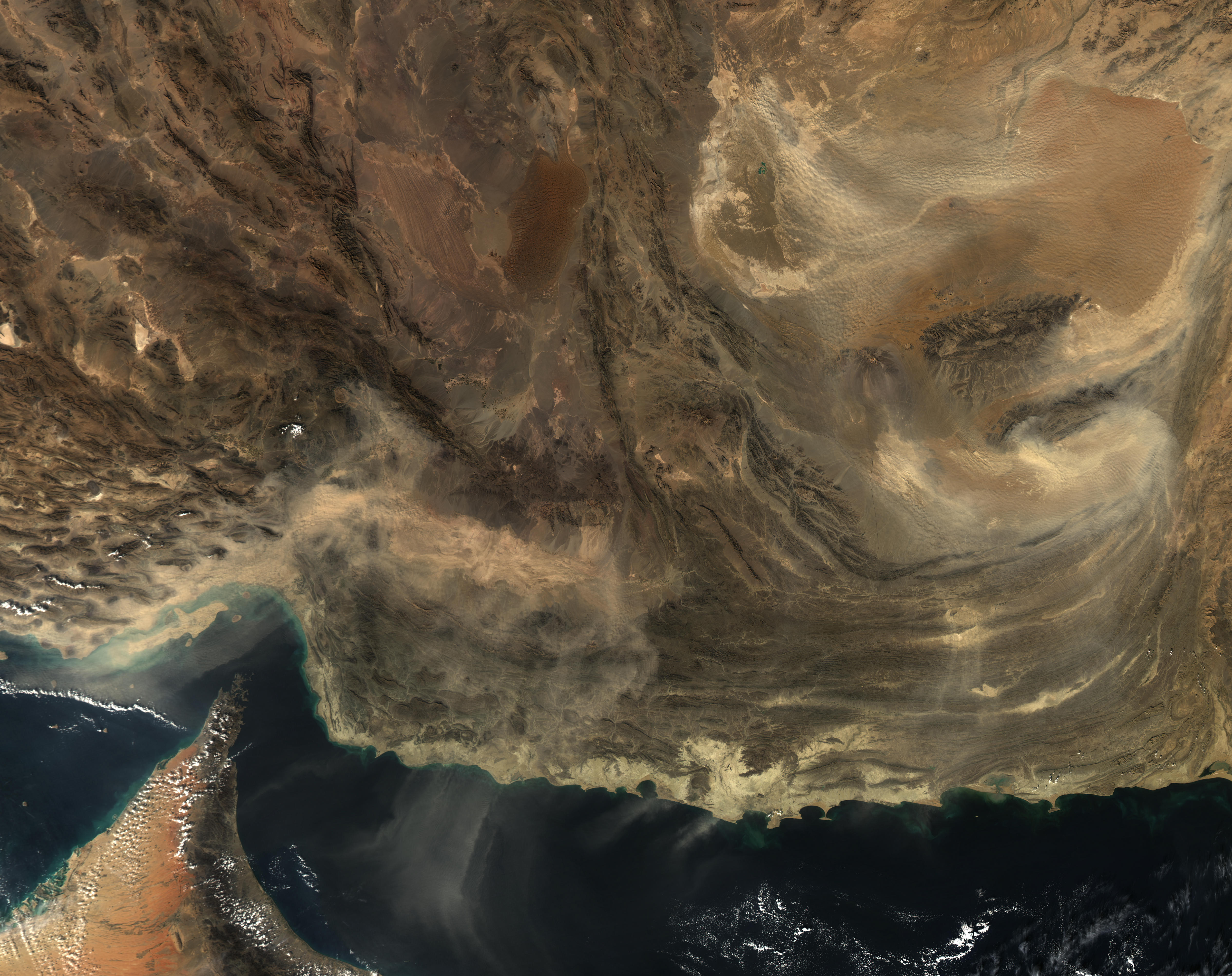 A thin veil of white dust blurs the shorelines of Iran and Pakistan in this true-color Moderate Resolution Imaging Spectroradiometer (MODIS) image. The image, taken on November 23, 2003, by the Aqua satellite, shows blowing dust from the deserts and dry lakes in Iran (left), Pakistan (right), and Afghanistan (upper right in the high resolution image). The most obvious plumes are over the Persian Gulf, left, and the Gulf of Oman, right. In addition to the dust over the water, the high resolution image shows dust storms in Northern Pakistan’s Hamun-i-Mashkel and Afghanistan’s Gowd-e-Zereh, both dry lake beds.