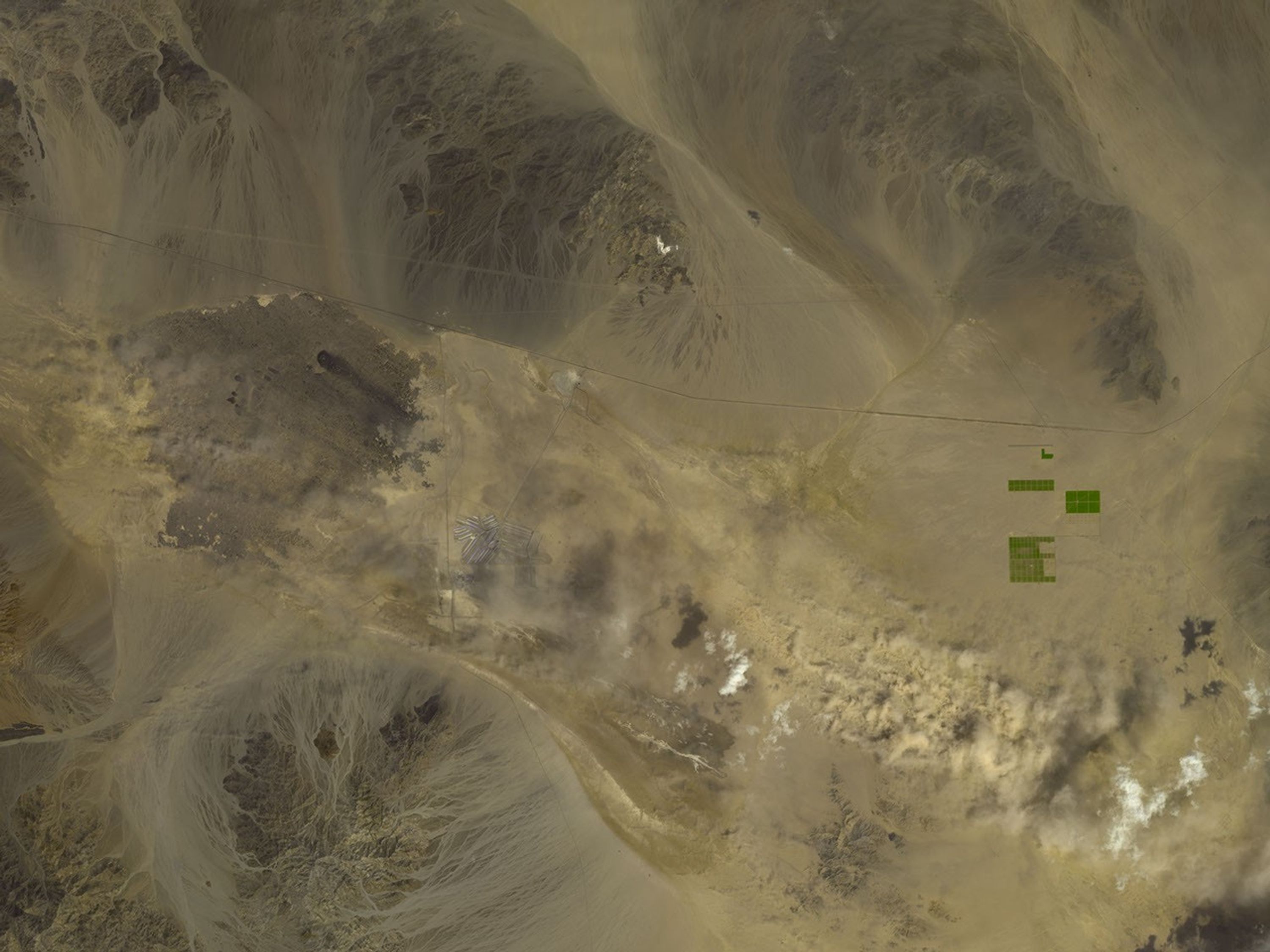 East of the dust storm are salt works that stand out from the surrounding landscape thanks to their straight lines and sharp angles. Dark ground surfaces alternate with mined white salt in a network of stripes. When lakes evaporate, chemicals that had been dissolved in the water stay behind, making dry lake beds an ideal place to find heavy concentrations of minerals, including salt.