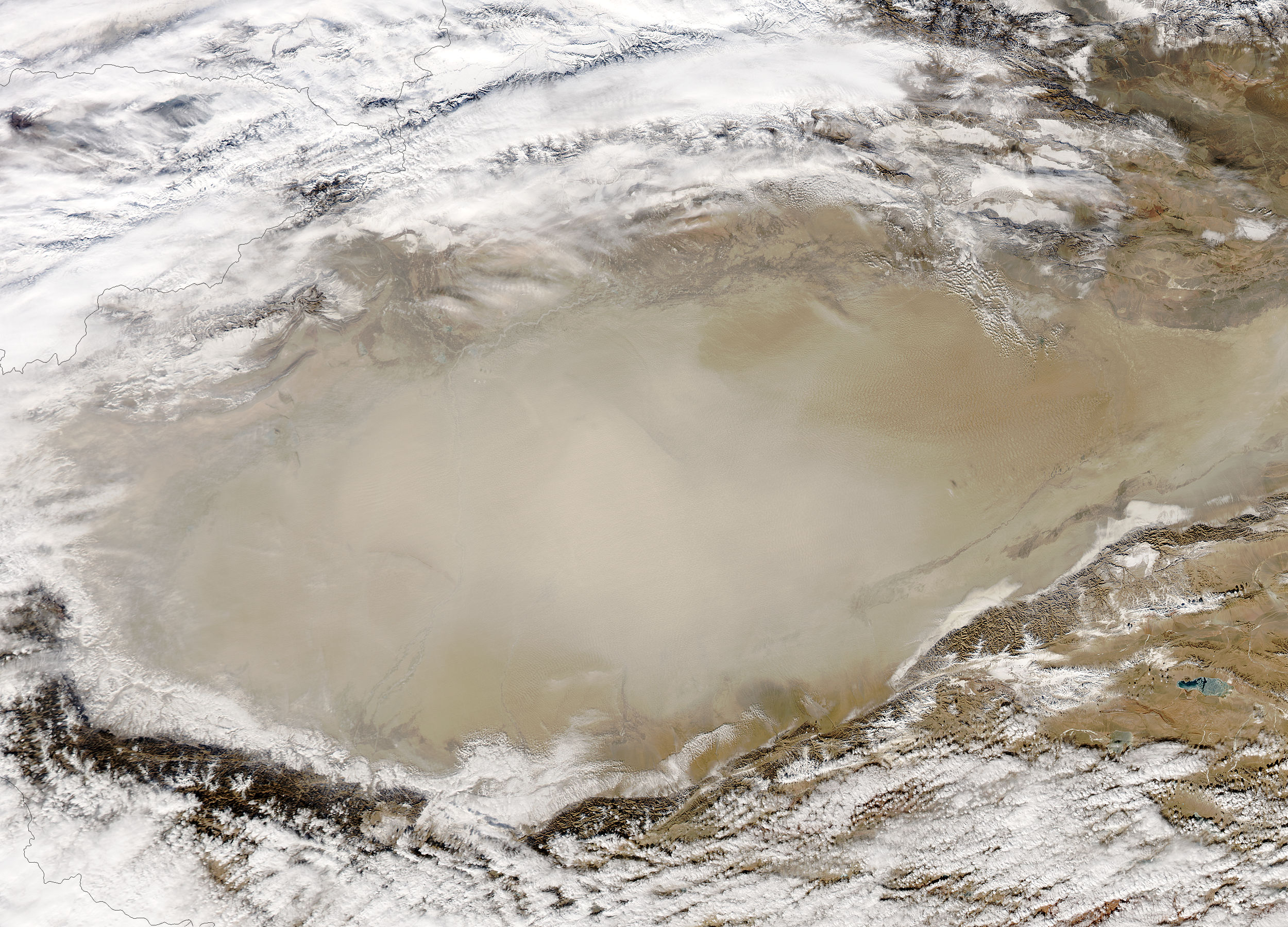 On January 30, 2005, dust filled the bowl of the Taklimakan Desert in western China. The low-lying basin is ringed by towering mountains to the north and south; these mountains steal almost all the precipitation passing through the region, leaving the Taklimakan bone dry. Dust storms, shifting sand dunes, and desert expansion are serious concerns for the people living in the area.
