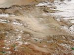 Dust and clouds filled the sky over western China on November 9, 2012. The Moderate Resolution Imaging Spectroradiometer (MODIS) on NASA’s Aqua satellite captured this natural-color image the same day. This dust storm occurred just off the eastern margin of the Taklimakan Desert, and had been blowing out of the area for days prior to the MODIS acquisition.
