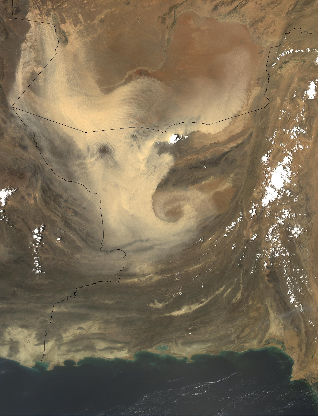 On July 4, 2003, a dust storm was blowing over the deserts of southern Afghanistan (top) and the rugged terrain of northwest Pakistan (bottom). The light tan color of the dust makes waves, swirls, ripples, and curves over the dark brown and gray terrain below. At bottom is the Arabian Sea. This image was acquired by the Moderate Resolution Imaging Spectroradiometer (MODIS) on the Aqua satellite.