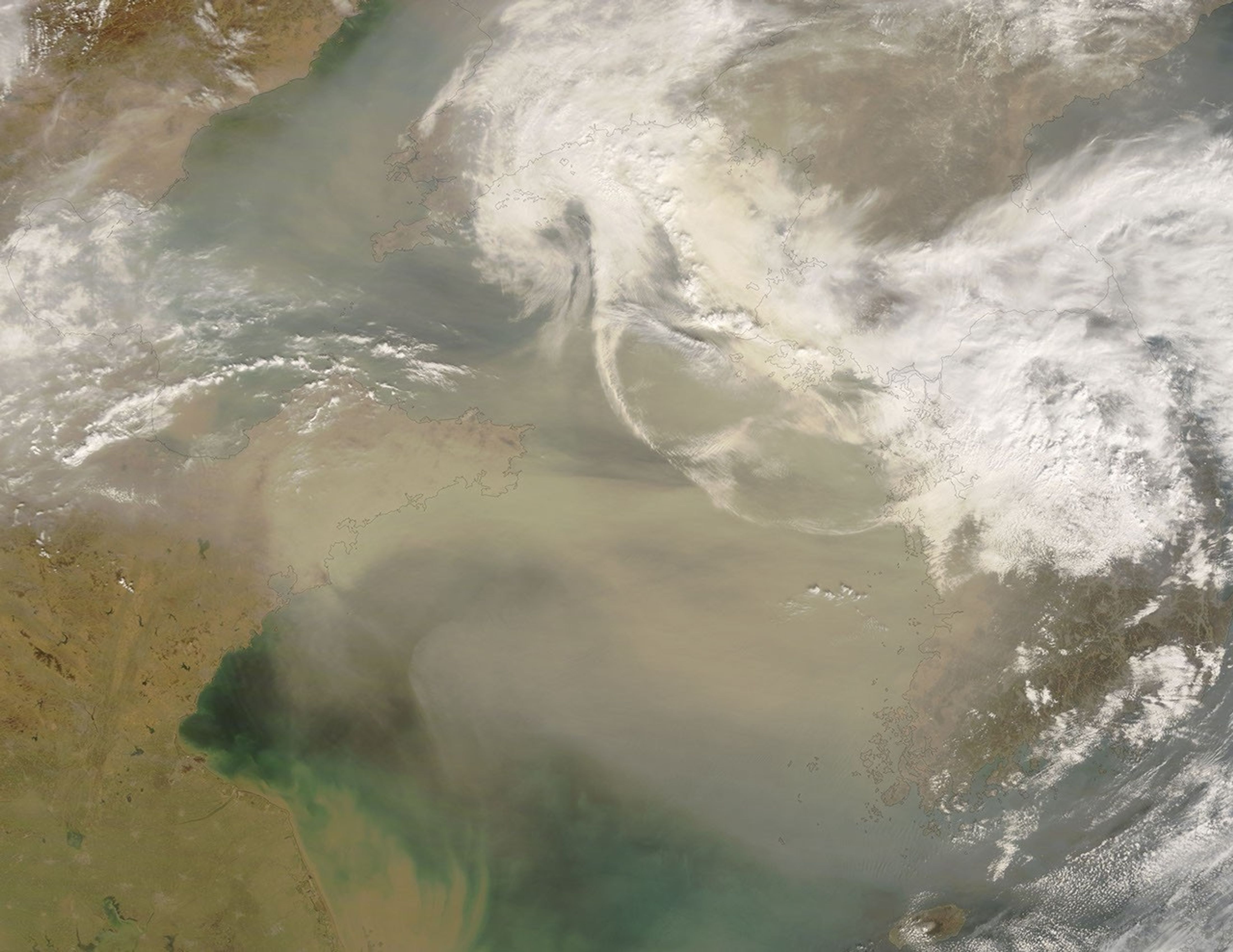 The top image shows a cloud of tan-colored dust south of Beijing, just beginning to pass over Bo Hai. The dust is thick enough to completely obscure the land surface below. The ripple pattern near the western edge of the plume results from midair waves of dust. The bottom image shows the dust plume continuing its eastward journey over the Yellow Sea, toward the Korean Peninsula. In this image, the dust plume has thinned somewhat, but remains a coherent mass of dust.