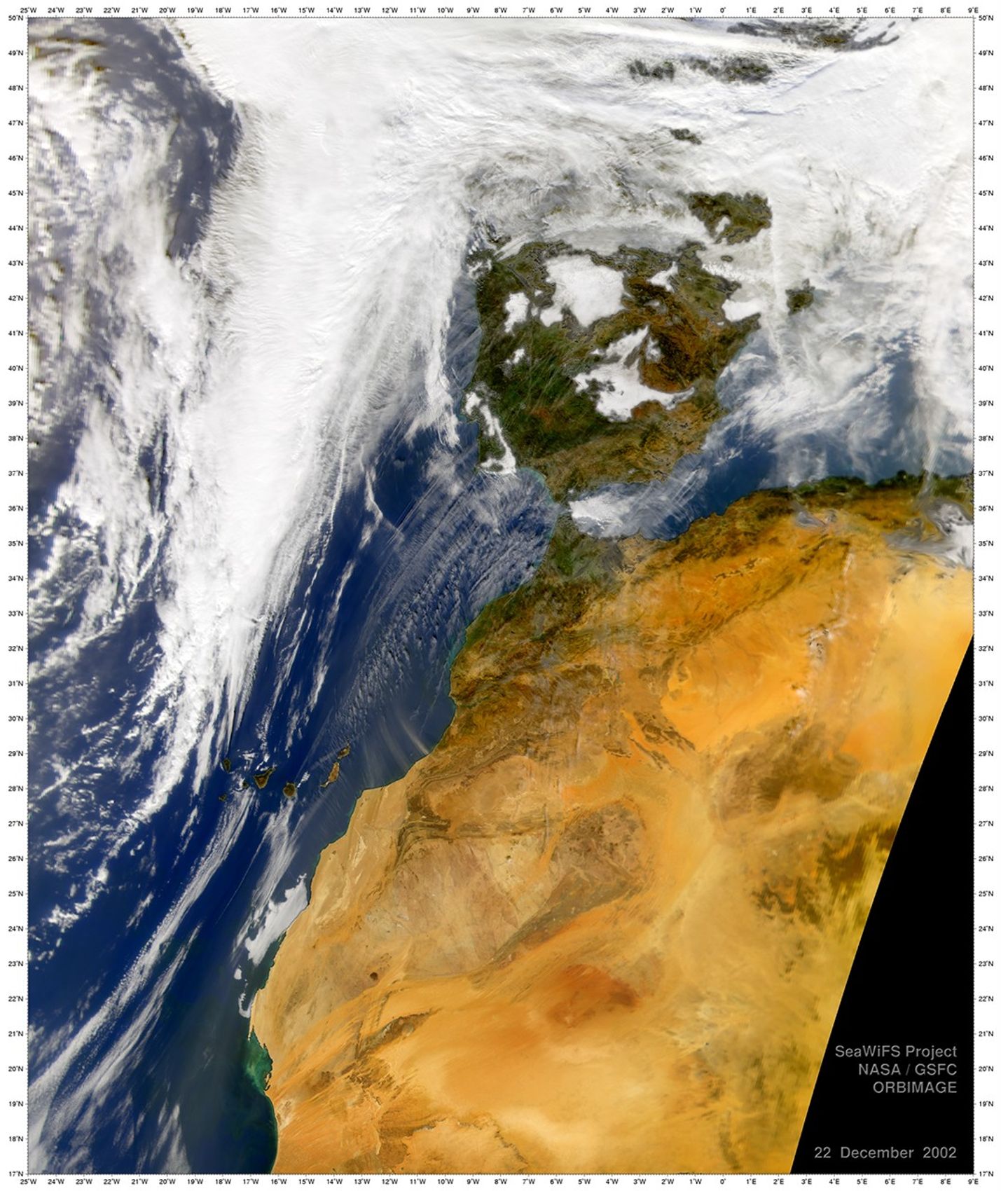 Some plumes of dust (brownish pixels) were visible to the Sea-viewing Wide Field-of-View Sensor (SeaWiFS) on December 22, 2002, blowing toward the northwest from Morocco.
