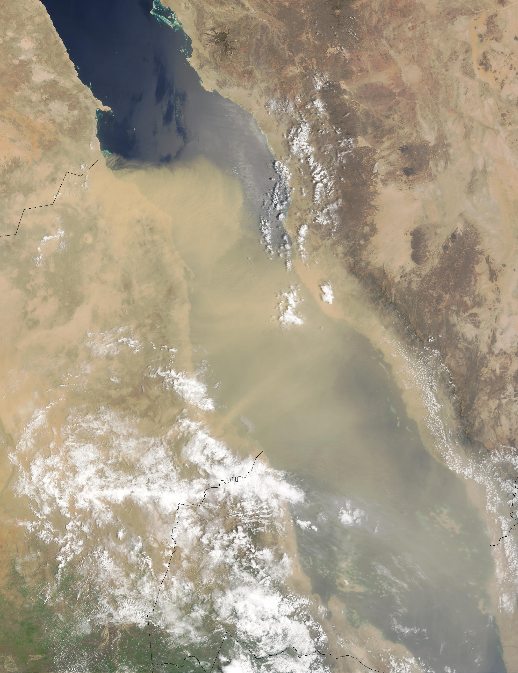 A great cloud of dust and sand hangs over the Red Sea (image center) in this image from the Moderate Resolution Imaging Spectroradiometer (MODIS) on the Terra satellite captured on August 20, 2003. The cloud of dust begins at the border of Egypt (top left) and Sudan (below) and stretches southward to Eritrea and eastward across the Red Sea to Saudi Arabia and Yemen.