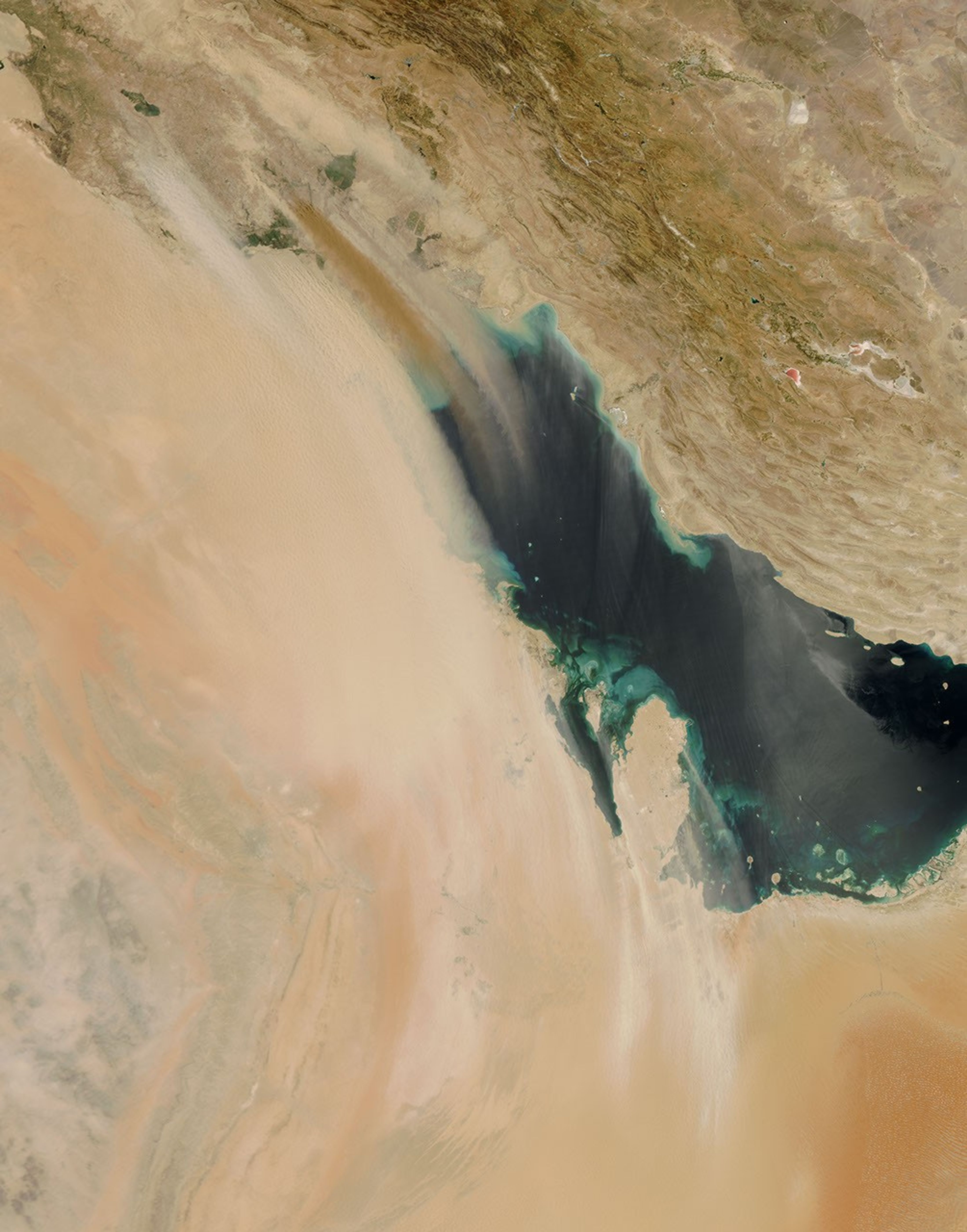 On June 2, 2012, a dust storm struck southeastern Iraq. Winds blew fine sediments toward the southeast, over the Persian Gulf, and into northeastern Saudi Arabia. Winds also kicked up streamers of dust in Qatar. The Moderate Resolution Imaging Spectroradiometer (MODIS) on NASA’s Aqua satellite captured this natural-color image the same day.