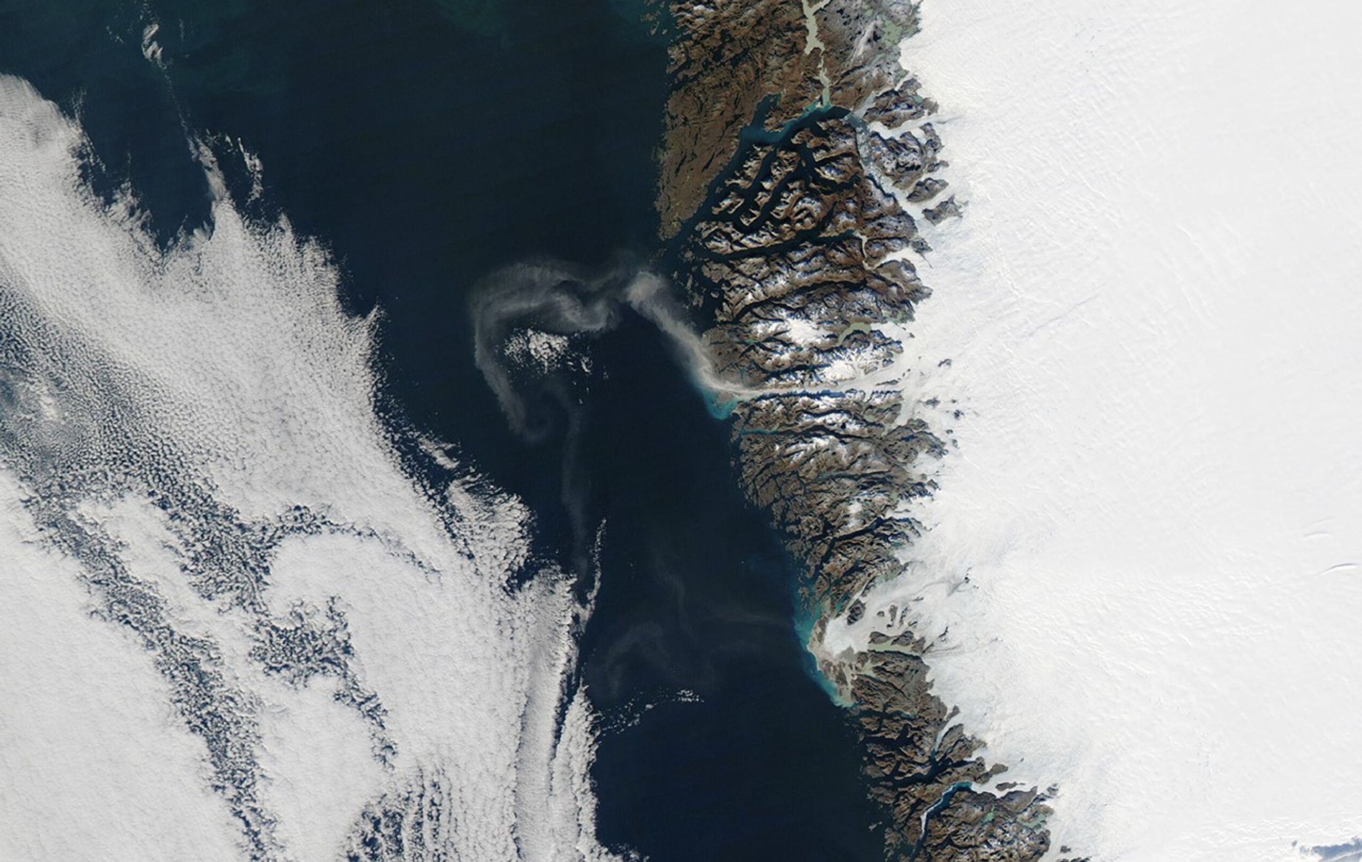 The detailed image above shows airborne silt arising from dry land near the Frederikshåb Isblink and Sermeq glaciers. Snow had not yet fallen on the area; when it does, it will prevent the wind from lifting more dust.
