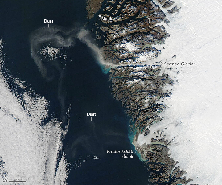 The detailed image above shows airborne silt arising from dry land near the Frederikshåb Isblink and Sermeq glaciers. Snow had not yet fallen on the area; when it does, it will prevent the wind from lifting more dust.