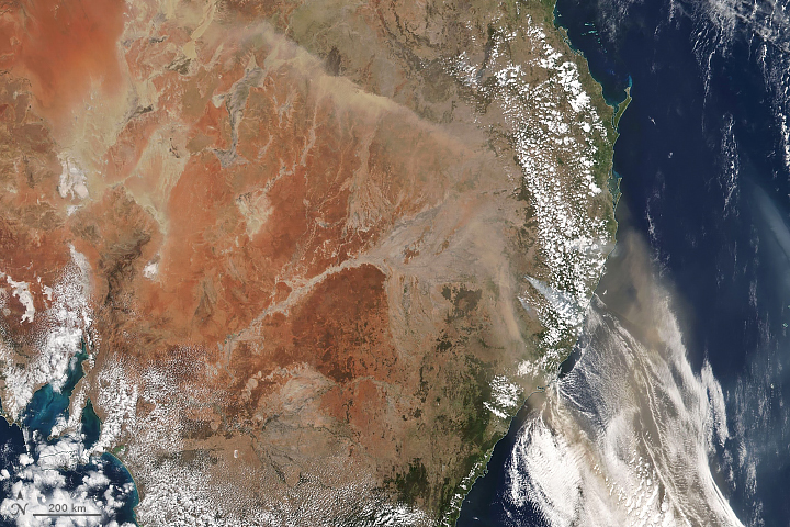 Notice the smoke from fires mixing in with the dust plume. The Tingha Plateau bush fire, for example, remained out of control and had burned 125 square kilometers (48 square miles) by the morning of February 13, according to the New South Wales Rural Fire Service.