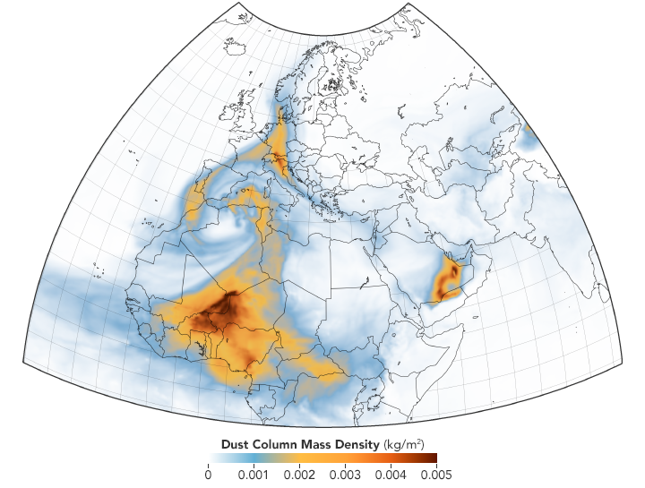 - NASA Earth Observatory (2021, June 22) African Dust Visits Europe.