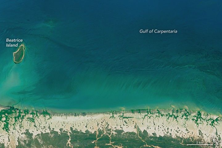 These natural-color images were acquired on July 15, 2014, and July 20, 2016, by the Operational Land Imager (OLI) on Landsat 8. They capture the extent of mangrove die-offs on a strip of beach along the Gulf of Carpentaria.