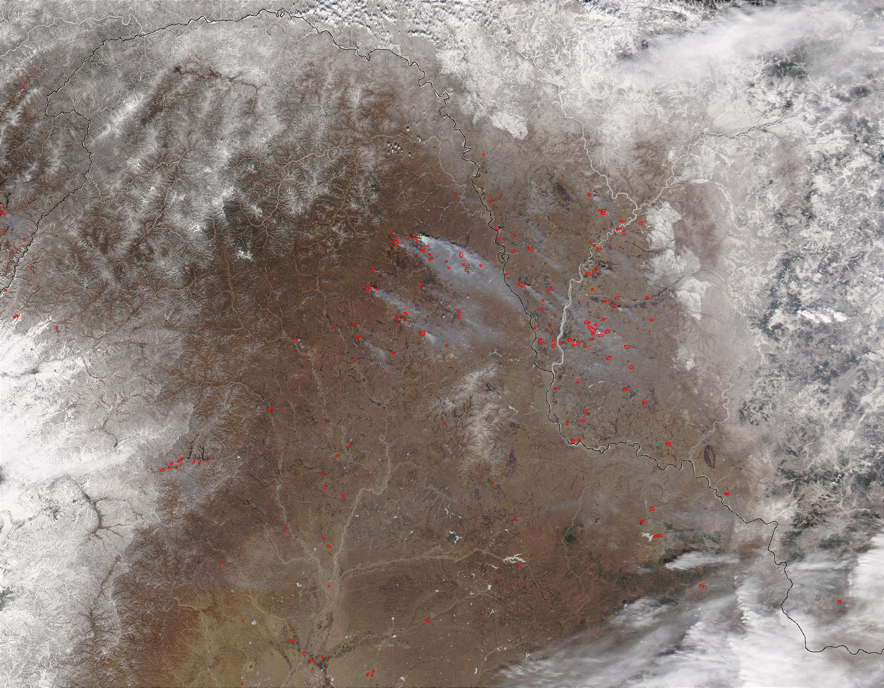 With Siberia still covered in snow (top), parts of northern China (left) and Russia (right) are thawing. Fires (red dots) indicate agricultural activity is underway, as farmers and ranchers prepare land for planting and pasture. This image was acquired on March 22, 2003.