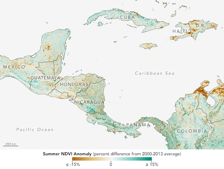 The map above shows NDVI anomalies in Central America and the Caribbean. A severe drought spread across southern Mexico to Panama. In July, affected areas in Guatemala, El Salvador, and Honduras experienced maize and bean losses from 75 to 100 percent. The Crop Monitor has largely classified maize conditions in Guatemala and Honduras as “failure” while yields in Haiti and El Salvador have mainly been classified as “poor.”