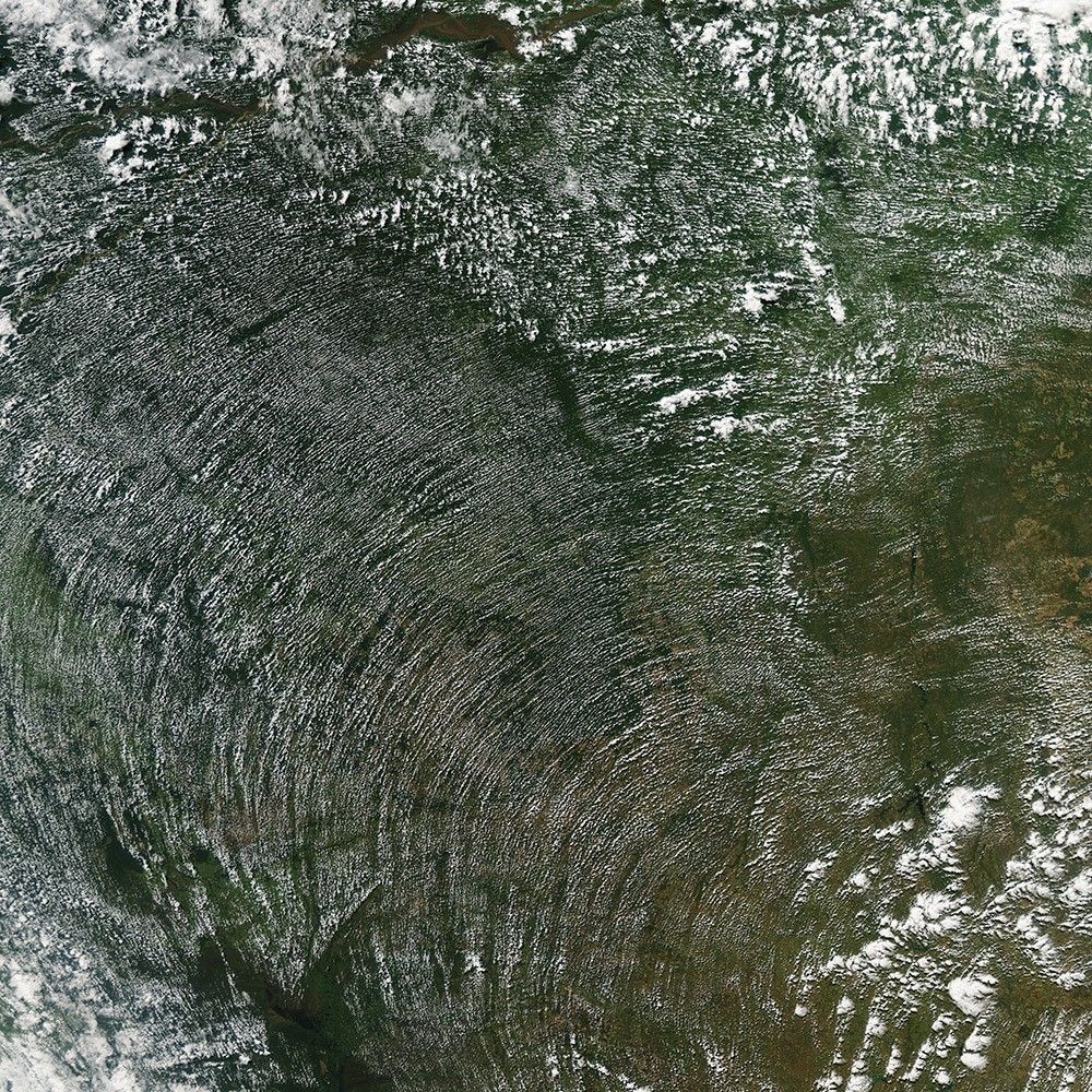In December 2009, the Landsat 5 satellite observed this extraordinary example of “hole-punch clouds” over West Virginia. This strange phenomenon results from a combination of cold temperatures, air traffic, and atmospheric instability.