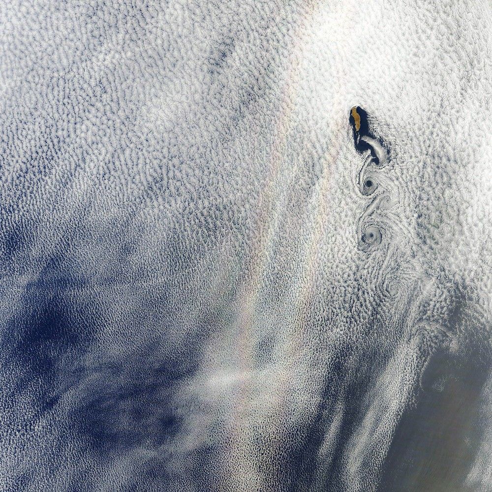 You can see how a layer of low clouds and fog obscures the lower elevations of the islands and the sea surface. But these clouds also hint at the complicated airflow patterns around and through the islands.