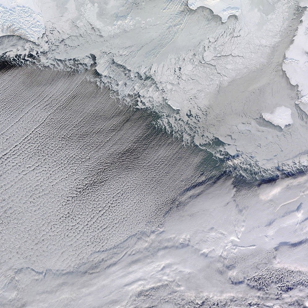Winds from the northeast pushed sea ice southward and formed cloud streets—parallel rows of clouds—over the Bering Strait in January 2010. The easternmost reaches of Russia, blanketed in snow and ice, appear in the upper left. To the east, sea ice spans the Bering Strait. Along the southern edge of the ice, wavy tendrils of newly formed, thin sea ice predominate.