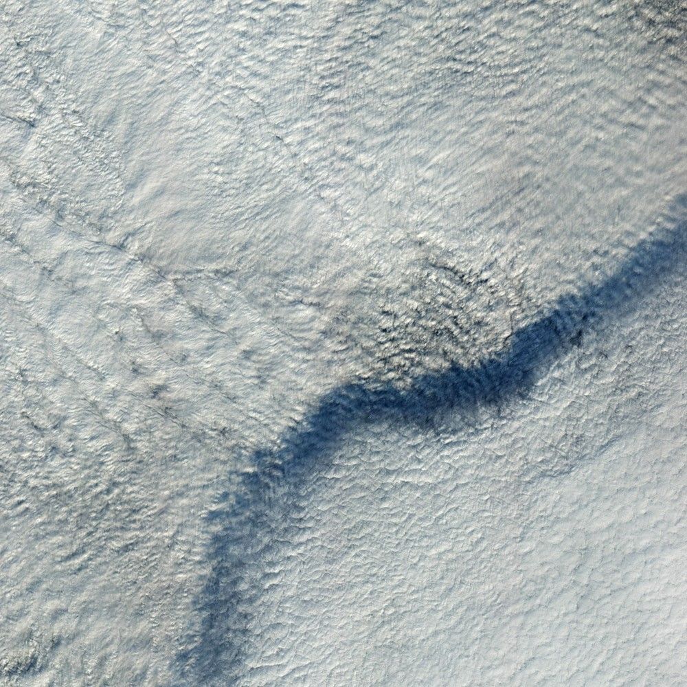 The exact reason for the hole in the clouds is somewhat of a mystery. It could have formed by chance, although imagery from the days before and after this date suggest something else was at work. It could be that the relatively unobstructed path of the clouds over the ocean surface was interrupted by thermal instability created by the iceberg. In other words, if an obstacle is big enough, it can divert the low-level atmospheric flow of air around it, a phenomenon often caused by islands.