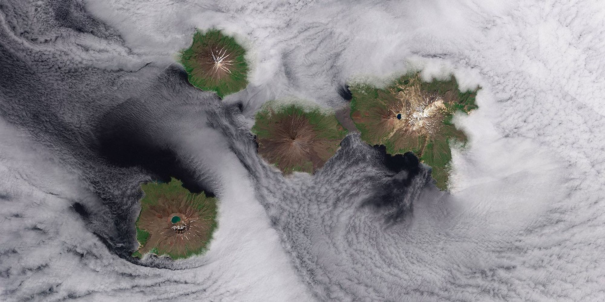 They are called the Islands of the Four Mountains. Part of the Aleutian Island chain, these peaks are actually the upper slopes of volcanoes rising from the seafloor: Carlisle, Cleveland, Herbert, and Tana. Standing in one of the most remote reaches of the world, these volcanoes have scarcely been studied. Satellite sensing makes that easier, as this Landsat 8 image from June 2013 shows.