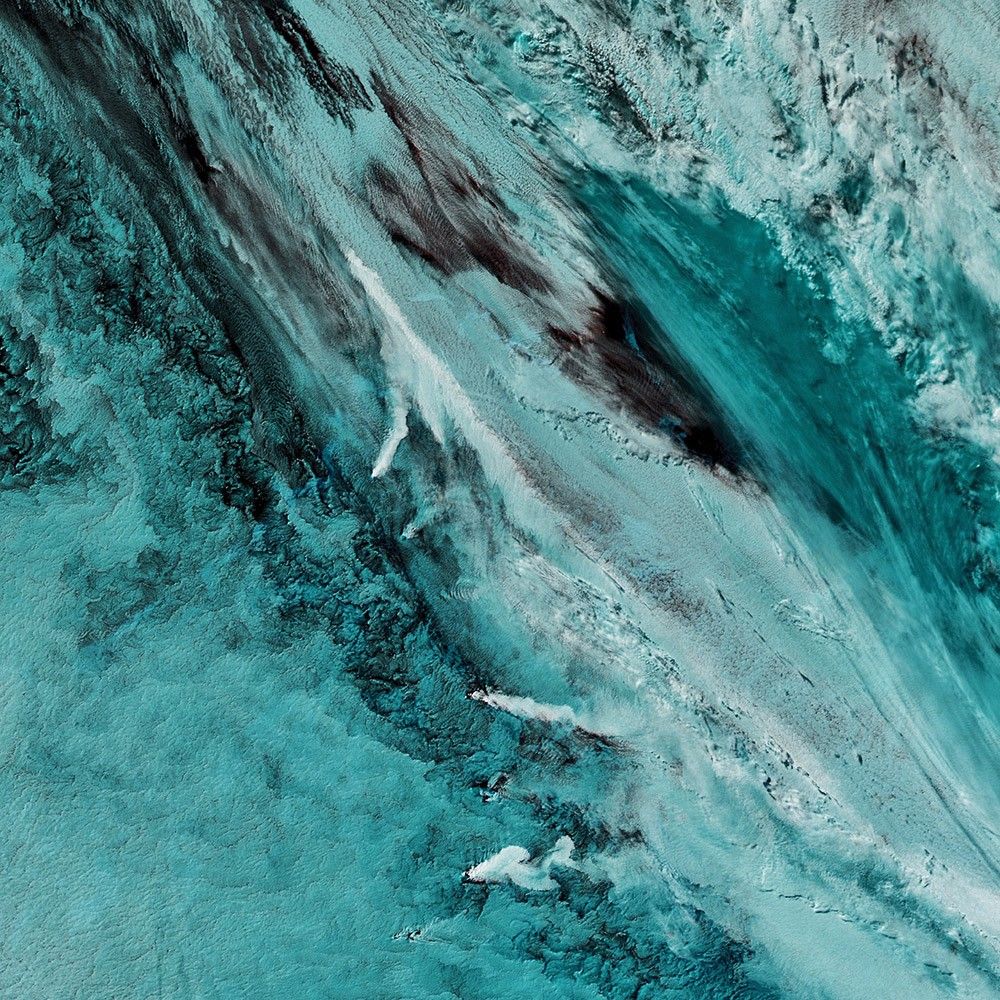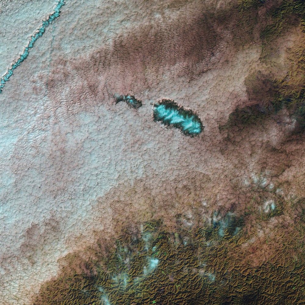 The combination of clouds and ice at these latitudes can make it difficult to see plumes of volcanic ash in natural-color imagery. But using portions of the electromagnetic spectrum that are typically invisible to the naked eye (such as infrared) enables satellites to distinguish ice from ash and clouds. The Aqua satellite captured this false-color image in September 2016. Note the three bright white plumes running down the middle third of the page; they are warmer and brighter in infrared than the cooler ice clouds (teal) around them.