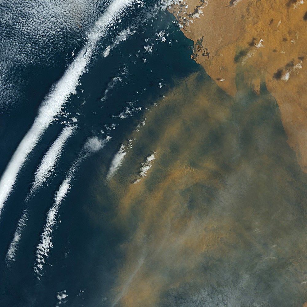 You cannot see it directly, but air masses from Africa and the Atlantic Ocean are colliding in this Landsat 8 image from August 2016. The collision off the coast of Mauritania produces a wave structure in the atmosphere.