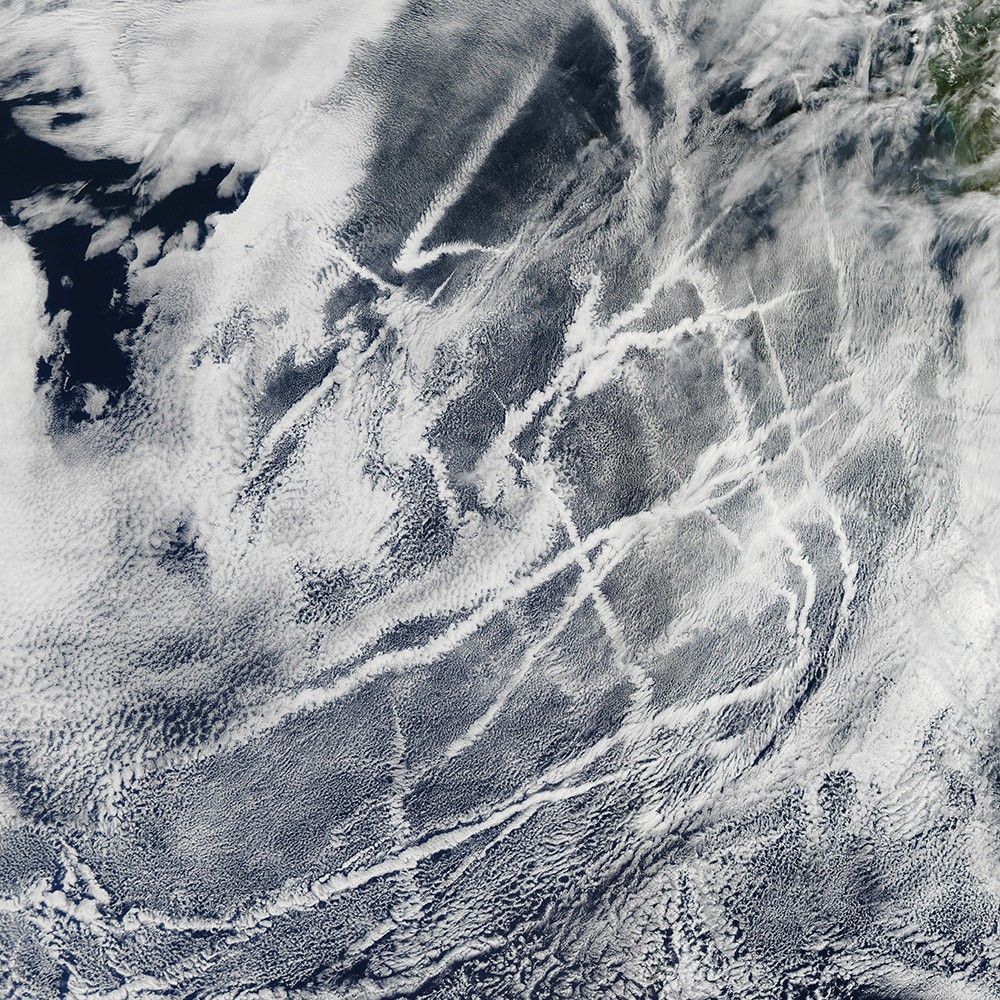 Ships steaming across the Pacific Ocean left this cluster of bright cloud trails lingering in the atmosphere in February 2012. The narrow clouds, known as ship tracks, form when water vapor condenses around tiny particles of pollution from ship exhaust. The crisscrossing clouds off the coast of California stretched for many hundreds of kilometers from end to end. The narrow ends of the clouds are youngest, while the broader, wavier ends are older.