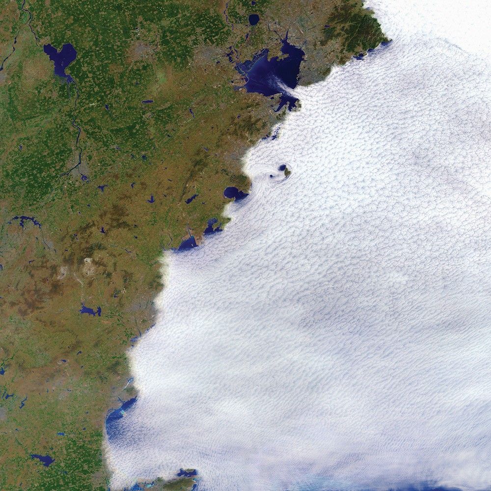 In this example from the coast of China, an onshore wind carries the clouds from the ocean toward the land. But the land is warmer, drier, and unfavorable for cloud growth. As a result, the marine clouds that move onshore tend to evaporate, leaving a cloud layer that traces the coastline.
