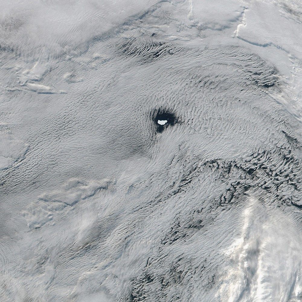 The exact reason for the hole in the clouds is somewhat of a mystery. It could have formed by chance, although imagery from the days before and after this date suggest something else was at work. It could be that the relatively unobstructed path of the clouds over the ocean surface was interrupted by thermal instability created by the iceberg. In other words, if an obstacle is big enough, it can divert the low-level atmospheric flow of air around it, a phenomenon often caused by islands.