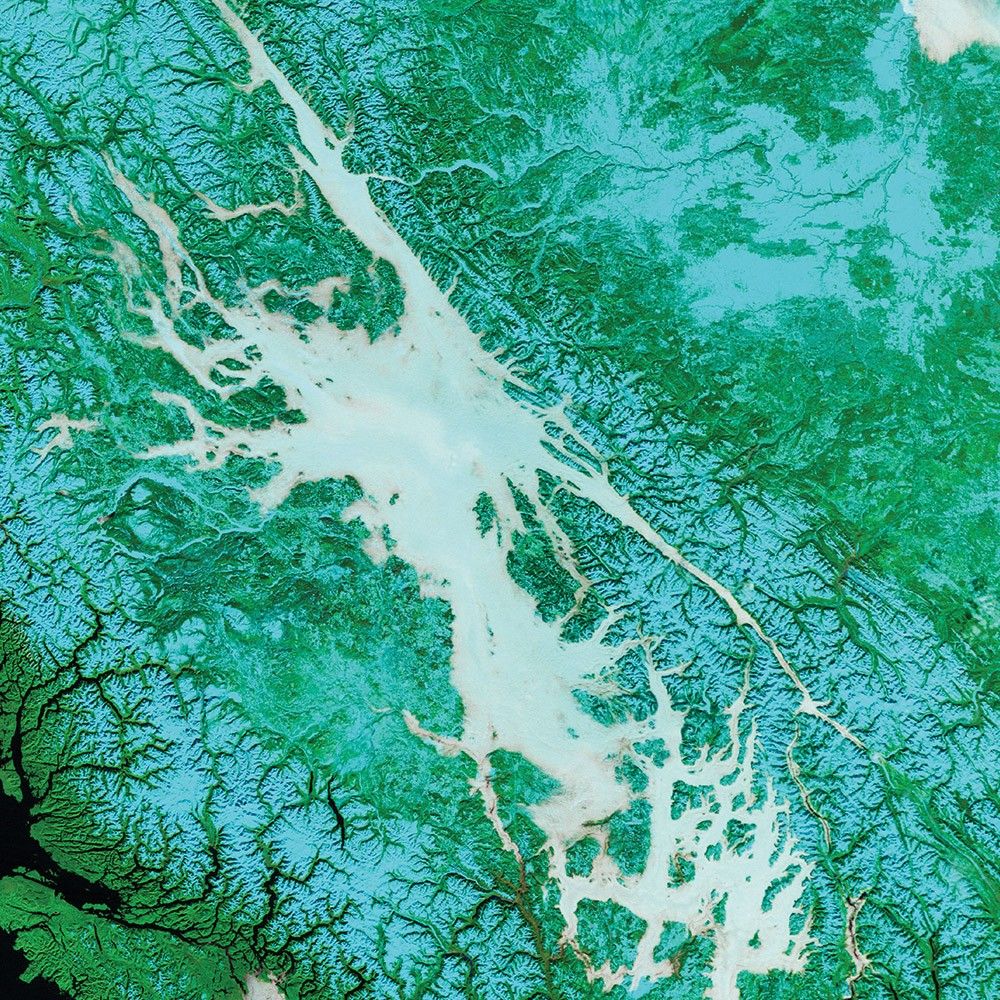This false-color image shows valley fog, which is common in the Pacific Northwest of North America. On clear winter nights, the ground and overlying air cool off rapidly, especially at high elevations. Cold air is denser than warm air, and it sinks down into the valleys. The moist air in the valleys gets chilled to its dew point, and fog forms. If undisturbed by winds, such fog may persist for days. The Terra satellite captured this image of foggy valleys northeast of Vancouver in February 2010.