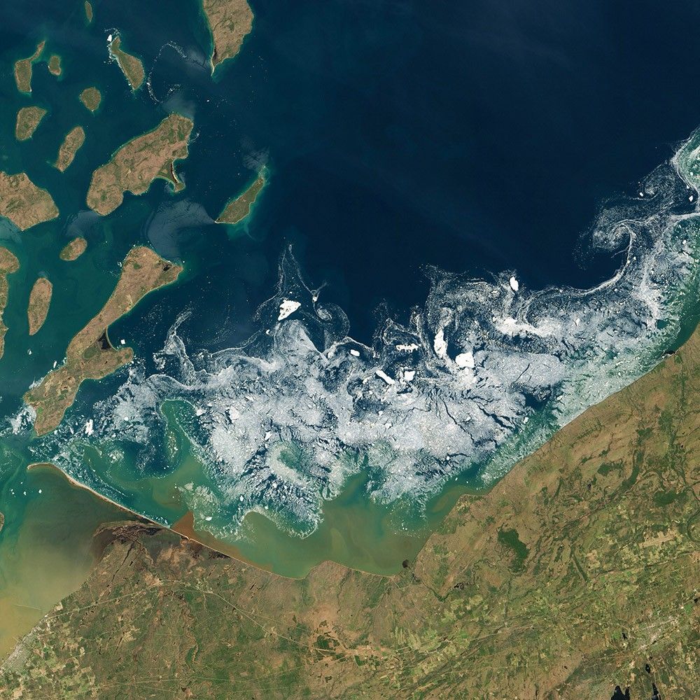A wide variety of ice forms in the Caspian Sea, which stretches from Kazakhstan to Iran. Just offshore, a well-developed expanse of consolidated ice appears bright white. Farther offshore, a gray-white field of chunky, hummocked ice has detached and is slowly drifting around a polynya, an area of open water surrounded by sea ice. That darker patch is actually growing young, thin ice and nilas, a term that designates sea ice crust up to 10 centimeters (4 inches) in thickness.