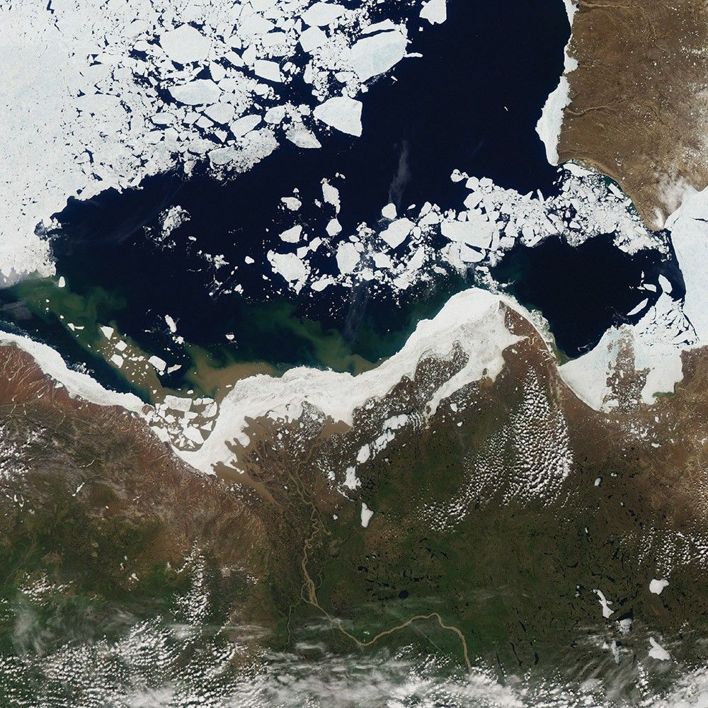 In the image, tan and brown water masses show up on both sides of the sea ice that crowds the shoreline of the river delta. A massive pulse of warm river water—colored by sediments and organic material flowing out from the Canadian interior—flows right under the ice. The pulse raised offshore water temperatures across hundreds of kilometers and seemed to contribute to the melting and dispersal of nearby sea ice.