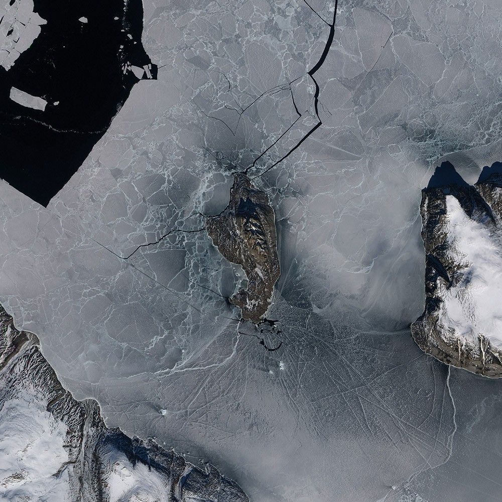The ice here tends to move with currents and eddies, which has shaped it into rough circles. The eddies may result from opposing winds from the north and southwest.