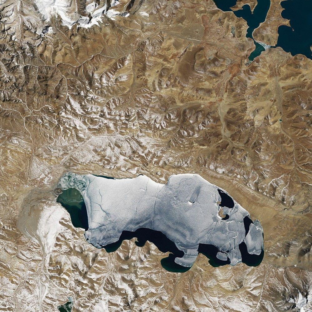 Puma Yumco is one of the larger lakes in southern Tibet. Tuiwa, a small village along the eastern edge of the lake, is reportedly one of the highest settlements in the world. Every winter, Tuiwa villagers herd thousands of sheep across the lake’s frozen surface to two small islands, where the soil is more fertile and the forage is better.