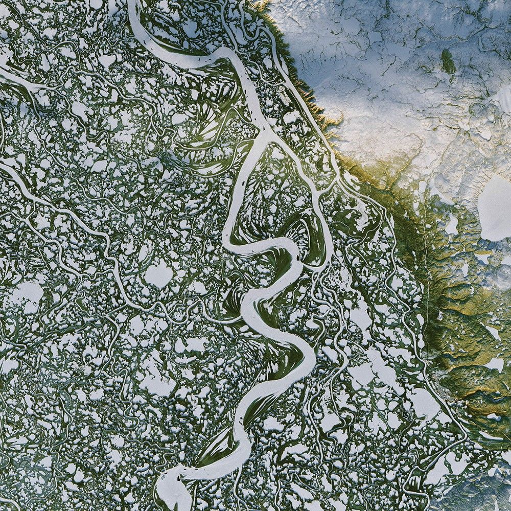 In the Mackenzie River Delta of far northern Canada, snow- and ice-covered waterways stand out amid green, pine-covered land. Those frozen tributaries also become ice roads for trucks carrying supplies between the remote outposts of Inuvik and Tuktoyaktuk.