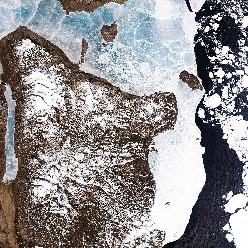 Some of the fast ice in this image is blue, likely because it is composed of large crystals that were stretched by the relentless, transformative action of wind.