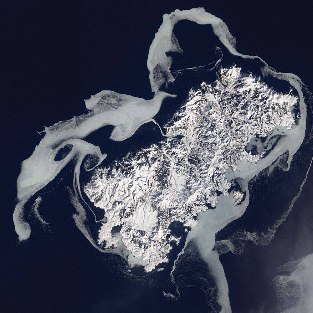 On the eastern promontory, “fast ice” clings to the shoreline. Common over shallow ocean waters along shorelines, fast ice holds fast to the shore or sea bottom, not moving with winds or currents. Off the coast, pieces of bright white sea ice float on the sea surface at the whim of the elements.