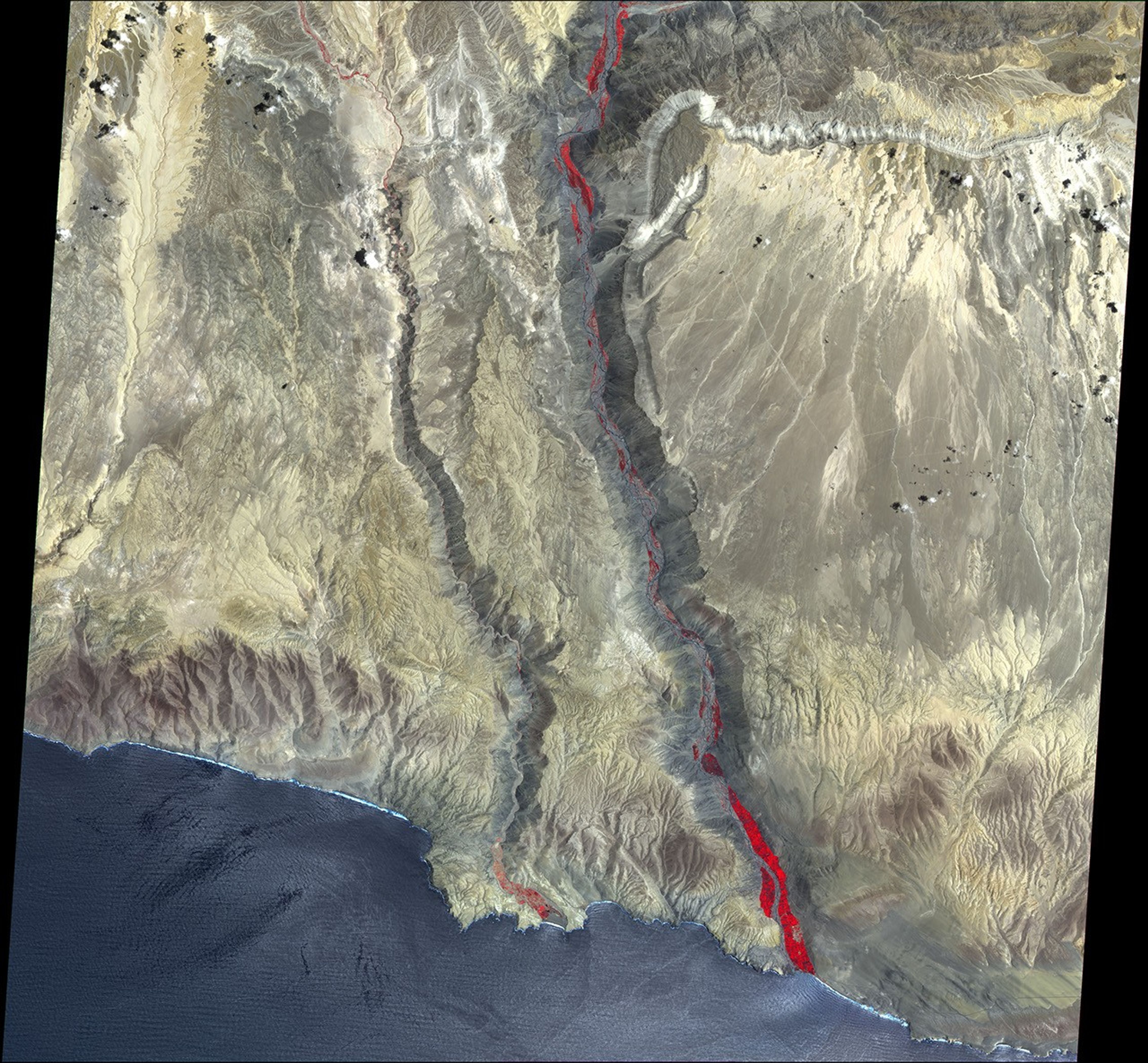The above image was taken by the Advanced Spaceborne Thermal Emission and Reflection Radiometer (ASTER) aboard NASA's Terra spacecraft on December 15, 2000, several months before the quake hit. The image is a false color composite composed of near-infrared, red, and green light, displayed as red, green, and blue, respectively. Vegetation appears bright red. The coastal cliffs and deep stream valleys running from north to south (top to bottom) across the image indicate the rapid rise (in geologic terms) of the terrain.