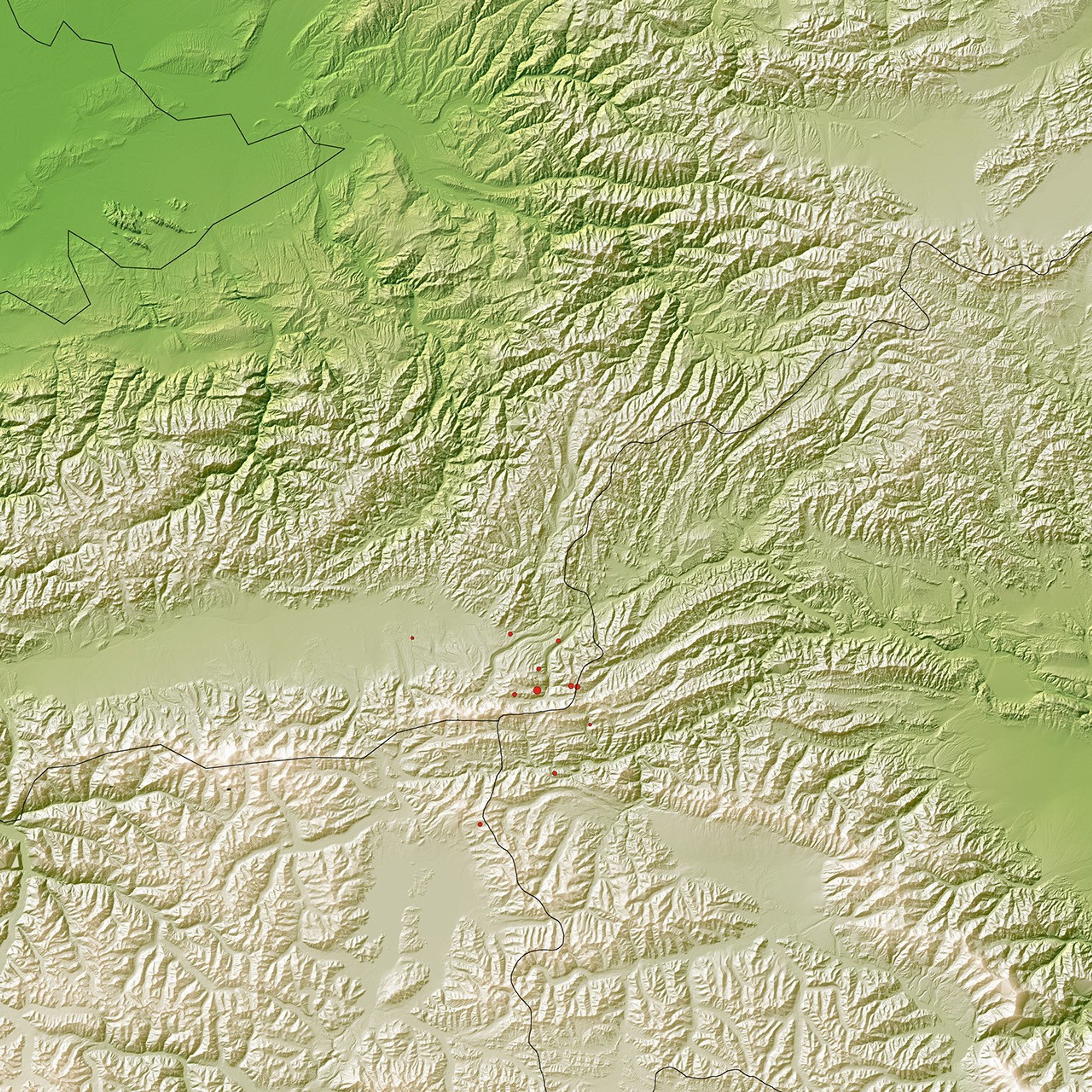 The process of mountain building continues, and earthquakes are an inevitable part of the process. Made up of mountains, Kyrgyzstan is frequently rattled by large earthquakes. The October 5 earthquake was centered in the Tien Shan Mountains near the Chinese border. Several moderate-sized aftershocks followed, and are represented on this map by red circles.