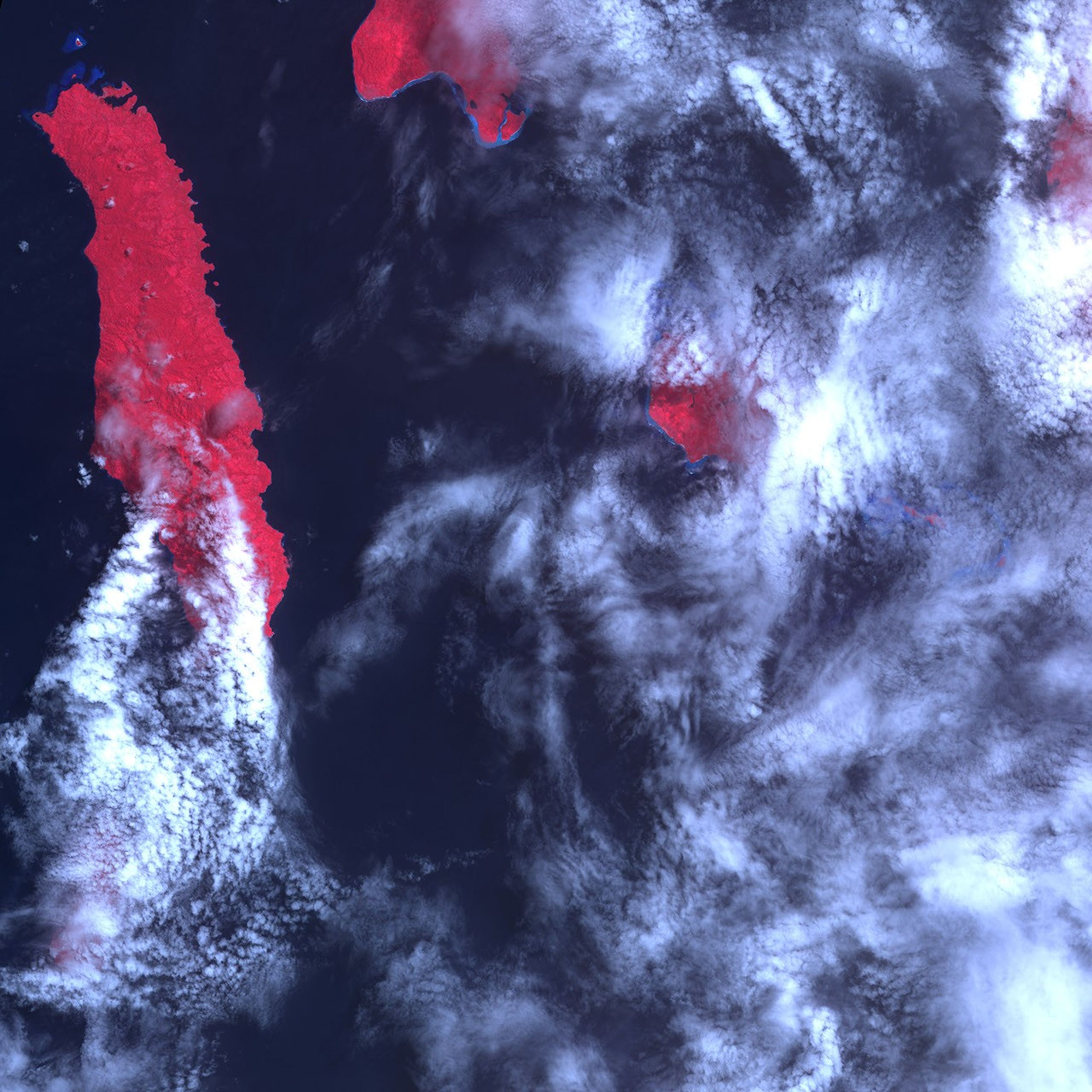 The newly exposed reef forms a gray rim along the eastern shore of the island in the left image, acquired by the Advanced Spaceborne Thermal Emission and Reflection Radiometer (ASTER) on April 12, 2007. In the right image, taken on March 31, 2006, the shallowly submerged reefs color the water a lighter shade of blue. The uplift may be more dramatic than the images show. When ASTER took the 2007 image, the tide was 29.4 centimeters higher than it was when the 2006 image was taken, and yet the uplift is still visible. The lush vegetation that covers the tropical island is bright red in this image, which is made from both visible and infrared light.