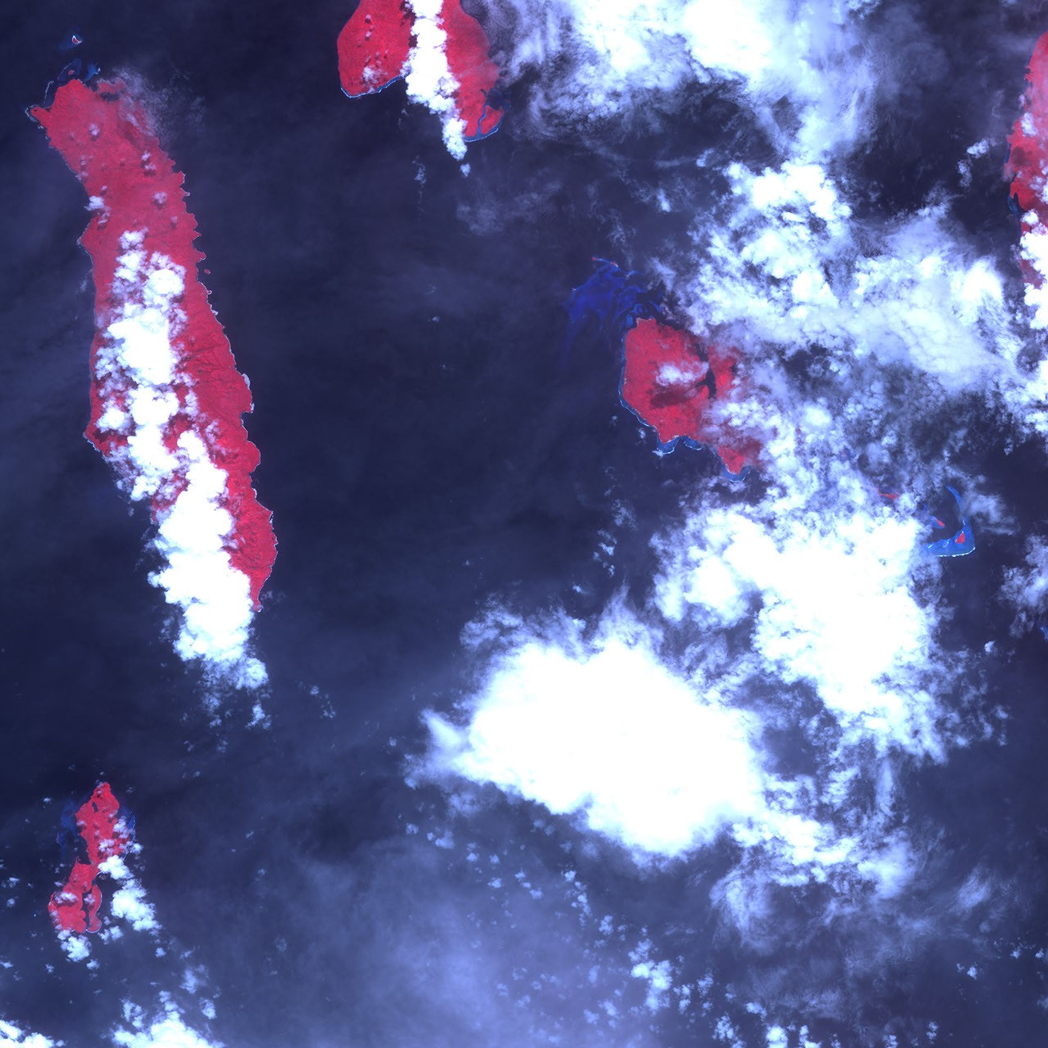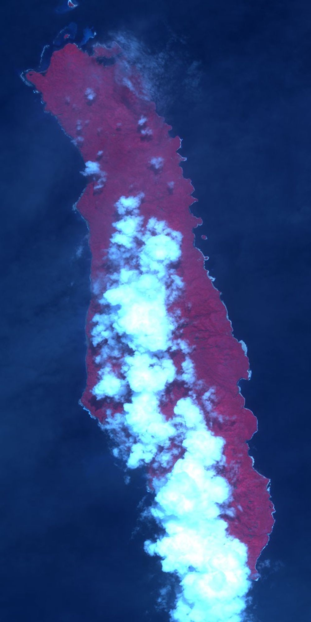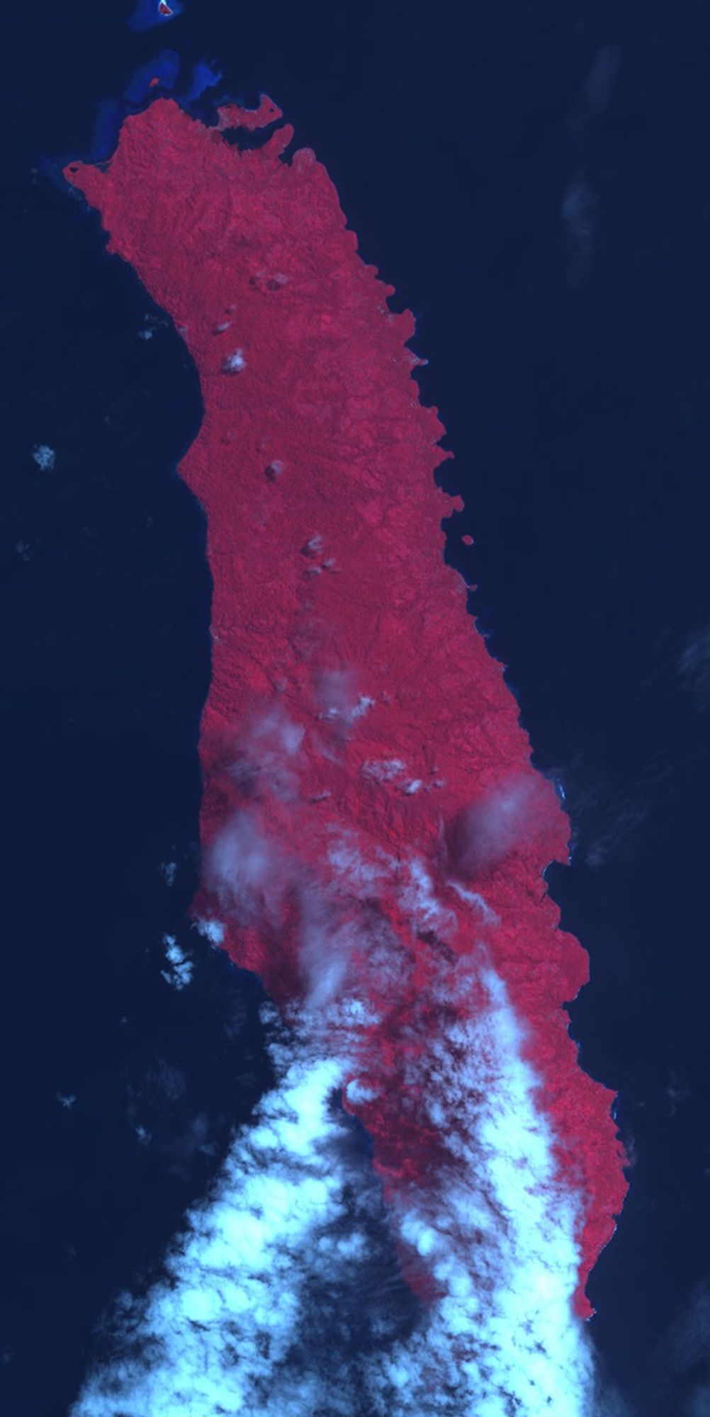 The newly exposed reef forms a gray rim along the eastern shore of the island in the left image, acquired by the Advanced Spaceborne Thermal Emission and Reflection Radiometer (ASTER) on April 12, 2007. In the right image, taken on March 31, 2006, the shallowly submerged reefs color the water a lighter shade of blue. The uplift may be more dramatic than the images show. When ASTER took the 2007 image, the tide was 29.4 centimeters higher than it was when the 2006 image was taken, and yet the uplift is still visible. The lush vegetation that covers the tropical island is bright red in this image, which is made from both visible and infrared light.