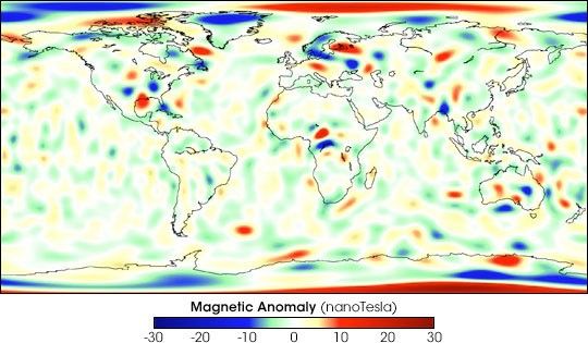 The map shows variations in Earth’s surface magnetism caused by varying concentrations of magnetic rocks and minerals in the Earth’s uppermost solid rock layer, known as the lithosphere. While magnetically charged objects exert a push or a pull simultaneously in many directions, the colors in this particular image represent only the vertical component of Earth’s surface magnetism. If you imagine the Earth as a giant spherical pin cushion, the lines of the push and pull shown here are like pins radiating vertically outward from, or inward toward, the center of our planet.