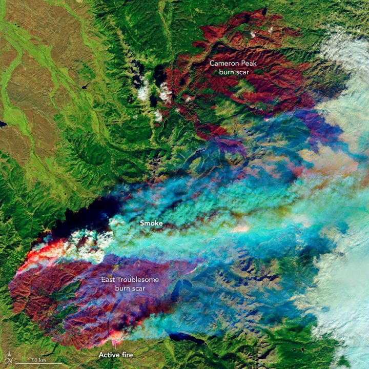 On October 14, 2020, a small fire started north of Hot Sulphur Springs in north-central Colorado. Within ten days, the East Troublesome fire had burned through more than 190,000 acres (77,000 hectares) and had become Colorado’s second largest fire (by area) on record. As of October 26, 2020, it was 15 percent contained.