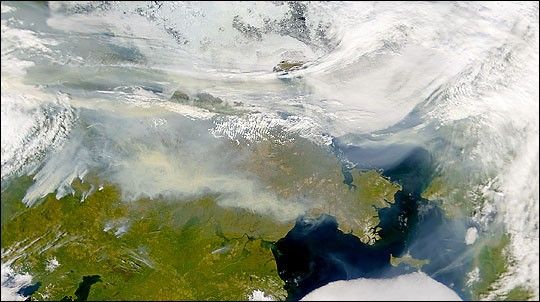 The lower left image shows the absorption of the black carbon aerosols in theatmosphere. Where the aerosols are most dense, the absorption ishighest. Red pixels indicate the highest levels of absorption, blues arelow.