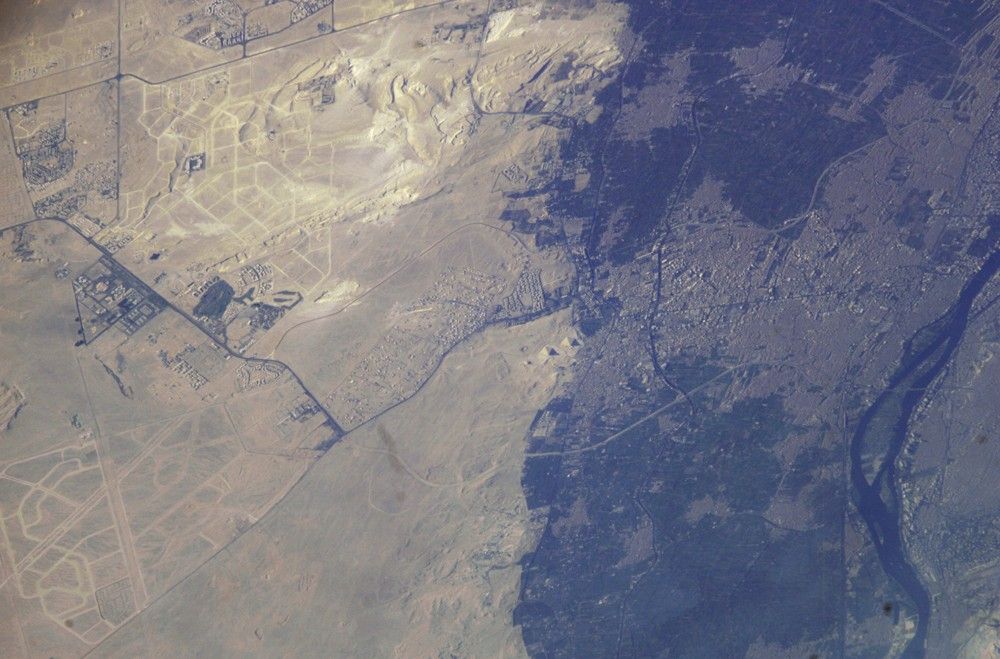 Today, Giza is a rapidly growing region of Cairo. Population growth in Egypt continues to soar, leading to new construction. New roads for large new developments are obvious in the desert hills northwest and southwest of the pyramids. Documenting patterns of urban growth around the world is a prime science objective for Earth photography by ISS astronauts.